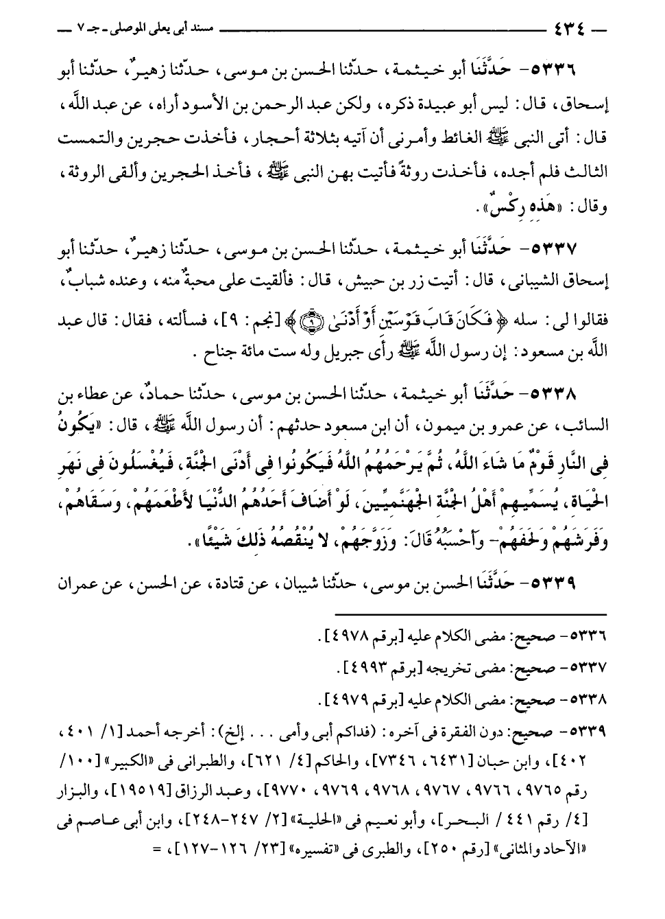 ٥٣٣٨ - حَدَّثَنَا أبو خيثمة، حدّثنا الحسن بن موسى، حدّثنا حماد، عن عطاء بن السائب، عن عمرو بن ميمون، أن ابن مسعود حدثهم: أن رسول الله - صلى الله عليه وسلم -، قال: "يَكُونُ فِي النَّارِ قَوْمٌ مَا شَاءَ اللَّهُ، ثُمَّ يَرْحَمُهُمُ اللَّهُ فَيَكُونُوا فِي أَدْنَى الجَنَّةِ، فَيُغْسَلُونَ فِي نَهَرِ الحيَاةِ، يُسَمِّيهِمْ أَهْلُ الجَنَّةِ الجهَنَّمِيِّينَ، لَوْ أَضَافَ أَحَدُهُمُ الدُّنْيَا لأَطْعَمَهُمْ، وَسَقَاهُمْ، وَفَرَشَهُمْ وَلحَفَهُمْ - وأَحْسَبُهُ قَالَ: وَزَوَّجَهُمْ، لا يُنْقُصُهُ ذَلِكَ شَيْئًا".