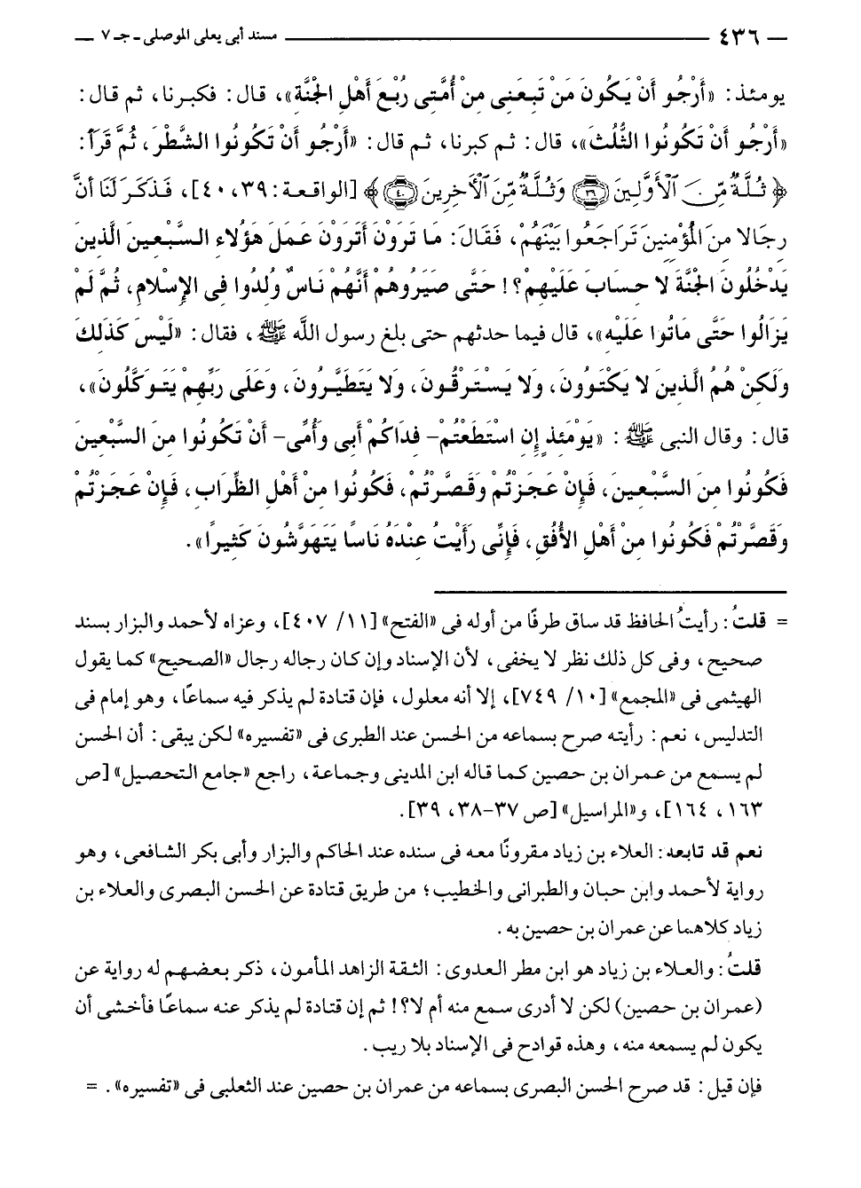 = قلتُ: رأيتُ الحافظ قد ساق طرفًا من أوله في "الفتح" [١١/ ٤٠٧]، وعزاه لأحمد والبزار بسند صحيح، وفى كل ذلك نظر لا يخفى، لأن الإسناد وإن كان رجاله رجال "الصحيح" كما يقول الهيثمى في "المجمع" [١٠/ ٧٤٩]، إلا أنه معلول، فإن قتادة لم يذكر فيه سماعًا، وهو إمام في التدليس، نعم: رأيته صرح بسماعه من الحسن عند الطبرى في "تفسيره" لكن يبقى: أن الحسن لم يسمع من عمران بن حصين كما قاله ابن المدينى وجماعة، راجع "جامع التحصيل" [ص ١٦٣، ١٦٤]، و"المراسيل" [ص ٣٧ - ٣٨، ٣٩].