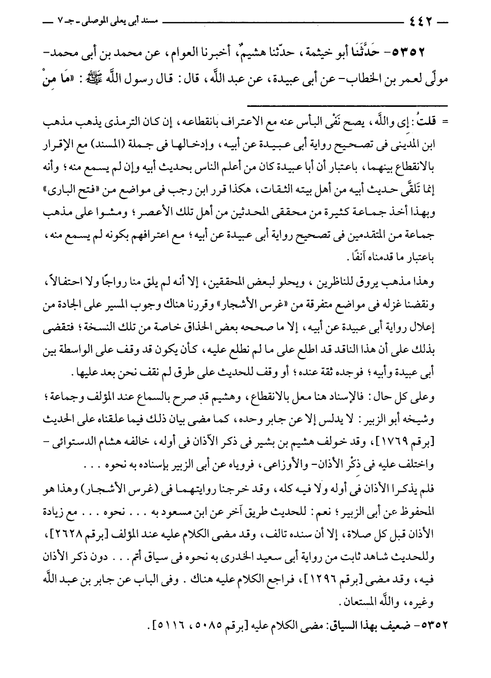 وهذا مذهب يروق للناظرين، ويحلو لبعض المحققين، إلا أنه لم يلق منا رواجًا ولا احتفالًا، ونقضنا غزله في مواضع متفرقة من "غرس الأشجار" وقررنا هناك وجوب المسير على الجادة من إعلال رواية أبى عبيدة عن أبيه، إلا ما صححه بعض الحذاق خاصة من تلك النسخة، فتقضى بذلك على أن هذا الناقد قد اطلع على ما لم نطلع عليه، كأن يكون قد وقف على الواسطة بين أبى عبيدة وأبيه؛ فوجده ثقة عنده؛ أو وقف للحديث على طرق لم نقف نحن بعد عليها.