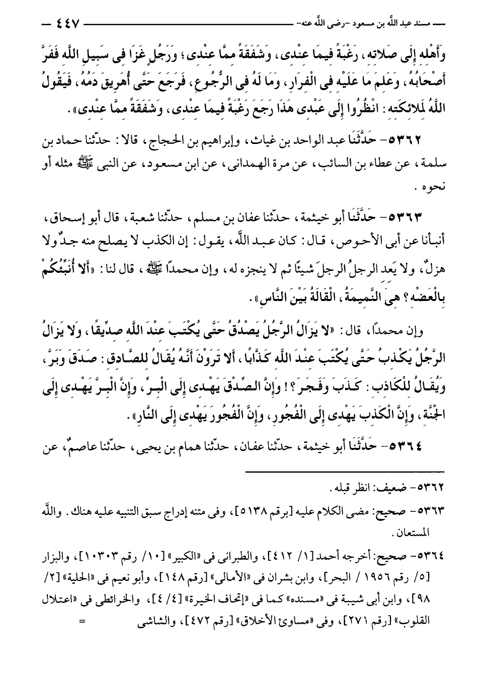 ٥٣٦٢ - حَدَّثَنَا عبد الواحد بن غياث، وإبراهيم بن الحجاج، قالا: حدّثنا حماد بن سلمة، عن عطاء بن السائب، عن مرة الهمدانى، عن ابن مسعود، عن النبي - صلى الله عليه وسلم - مثله أو نحوه.