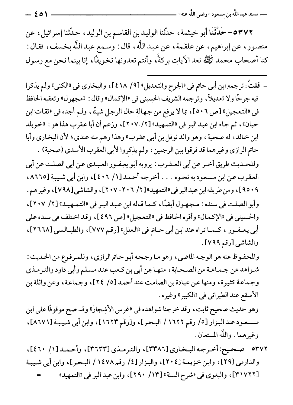 وللحديث طريق آخر عن أبى العقرب: يرويه أبو يعفور العبدى عن أبى الصلت عن أبى العقرب عن ابن مسعود به نحوه ... أخرجه أحمد [١/ ٤٠٦]، وابن أبى شيبة [٨٦٦٥، ٩٥٠٩]، ومن طريقه ابن عبد البر في "التمهيد" [٢/ ٢٠٦ - ٢٠٧]، والشاشى [٧٩٨]، وغيرهم. وأبو الصلت في سنده: مجهول أيضًا، كما قاله ابن عبد البر في "التمهيد" [٢/ ٢٠٧]، والحسينى في "الإكمال" وأقره الحافظ في "التعجيل" [ص ٤٩٦]، وقد اختلف في سنده على أبى يعفور، كما تراه عند ابن أبى حاتم في "العلل" [رقم ٧٧٧]، والطيالسى [٢٦٦٨]، والشاشى [رقم ٧٩٩].