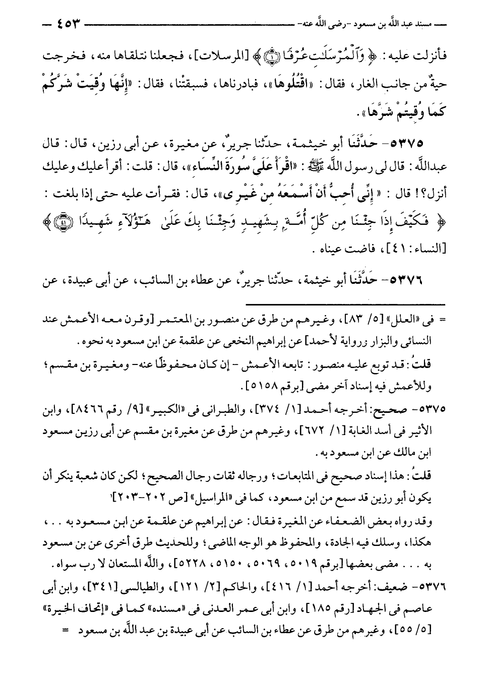 ٥٣٧٥ - صحيح: أخرجه أحمد [١/ ٣٧٤]، والطبرانى في "الكبير" [٩/ رقم ٨٤٦٦]، وابن الأثير في أسد الغابة [١/ ٦٧٢]، وغيرهم من طرق عن مغيرة بن مقسم عن أبى رزين مسعود بن مالك عن ابن مسعود به.