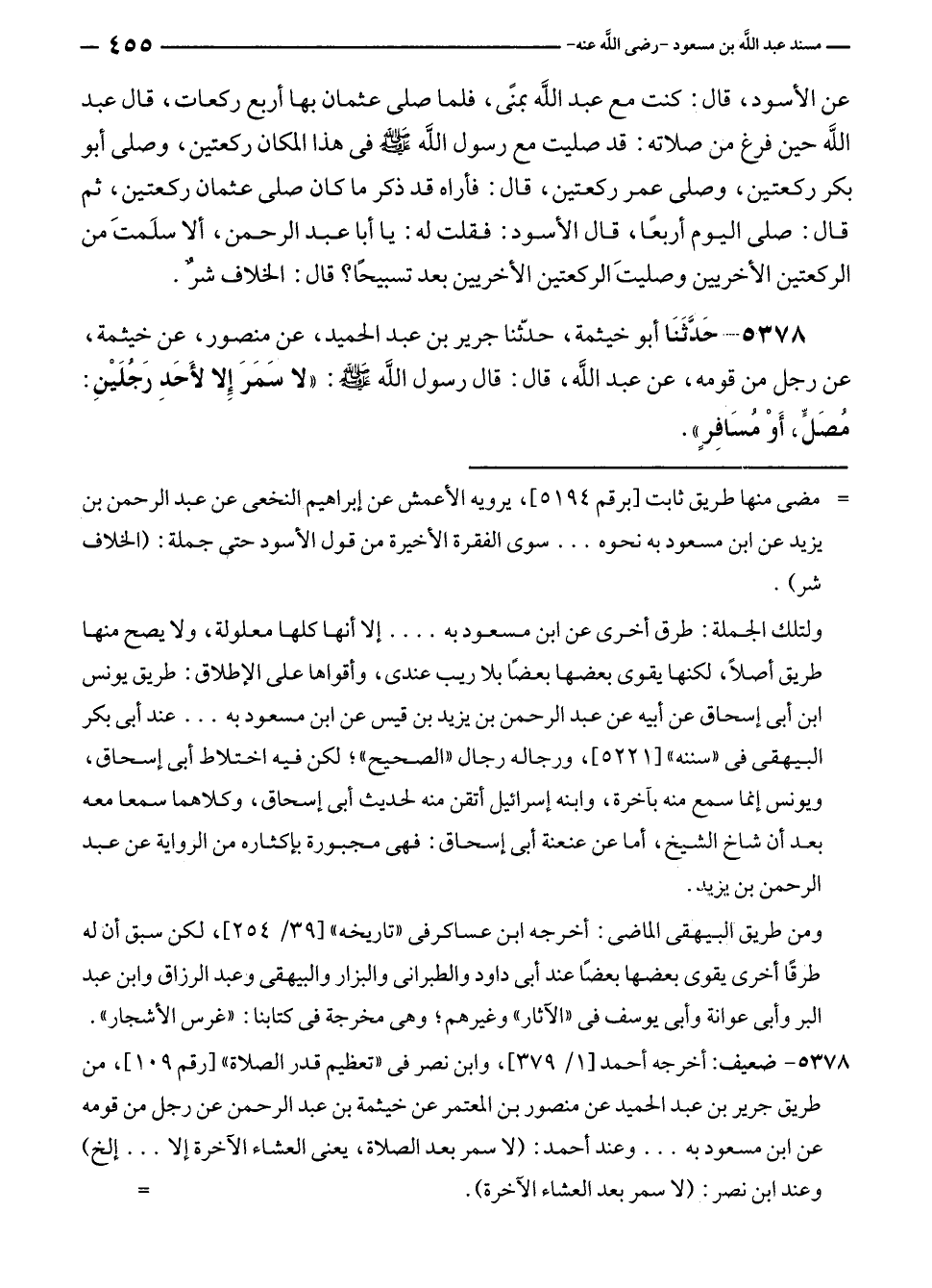 ٥٣٧٨ - حَدَّثَنَا أبو خيثمة، حدّثنا جرير بن عبد الحميد، عن منصور، عن خيثمة، عن رجل من قومه، عن عبد الله، قال: قال رسول الله - صلى الله عليه وسلم -: "لا سَمَرَ إلا لأَحَدِ رَجُلَيْنِ: مُصَلٍّ، أَوْ مُسَافِرٍ".