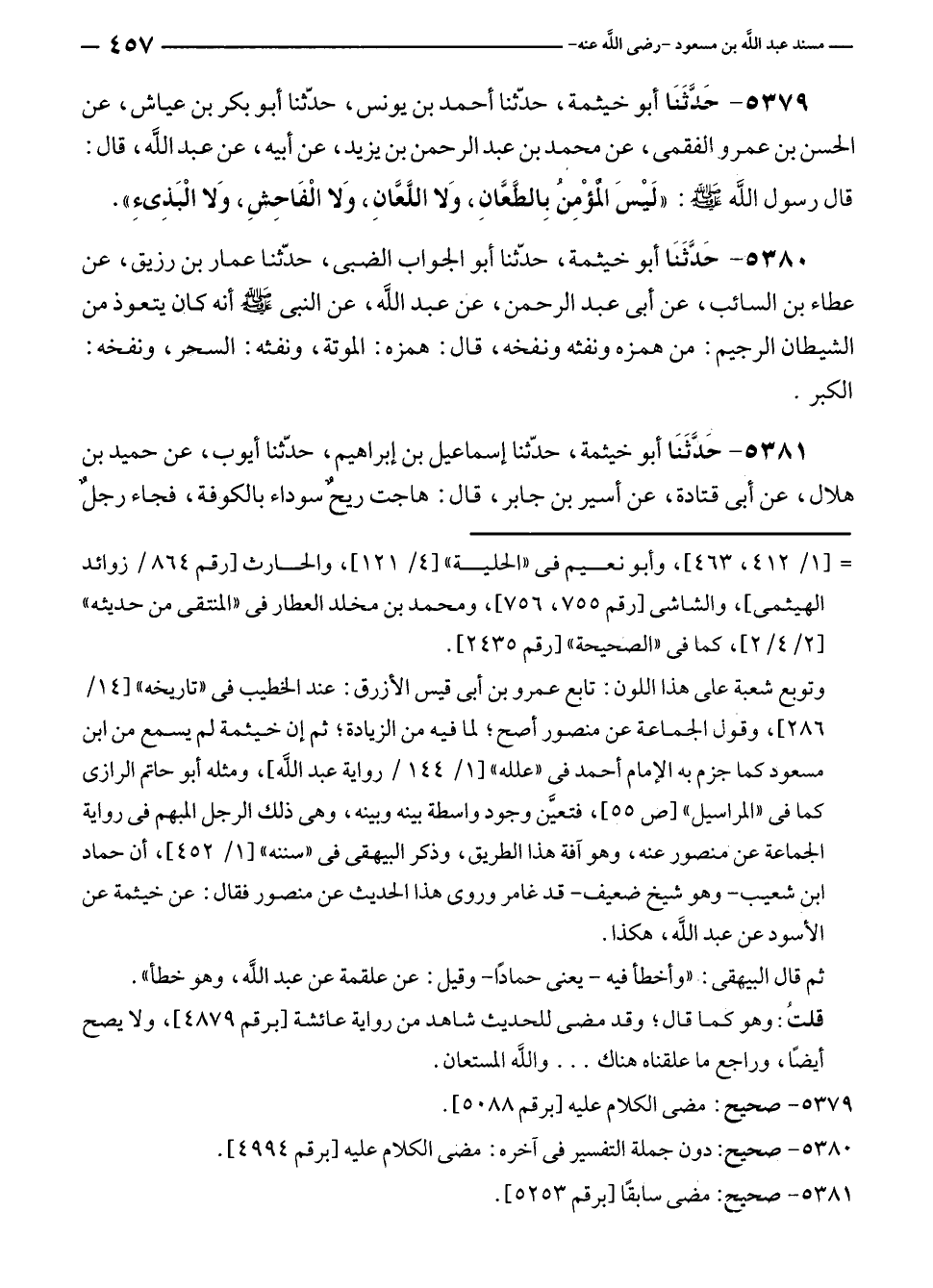 ٥٣٧٩ - حدَّثَنَا أبو خيثمة، حدّثنا أحمد بن يونس، حدّثنا أبو بكر بن عياش، عن الحسن بن عمرو الفقمى، عن محمد بن عبد الرحمن بن يزيد، عن أبيه، عن عبد الله، قال: قال رسول الله - صلى الله عليه وسلم -: "لَيْسَ المؤْمِنُ بِالطَّعَّانِ، وَلا اللَّعَّانِ، وَلا الْفَاحِشِ، وَلا الْبَذِئِ".