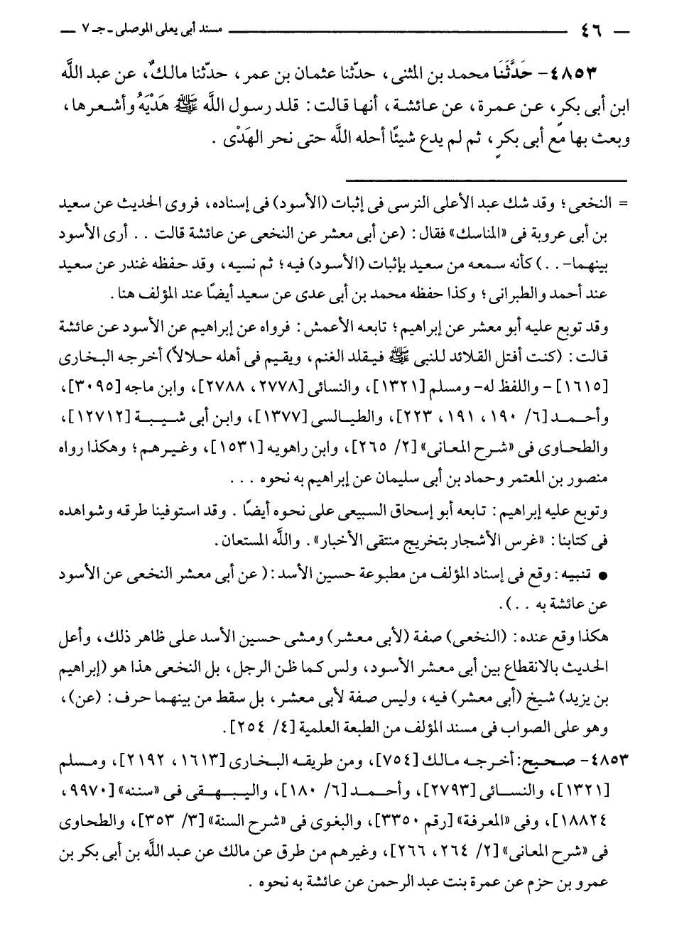 • تنبيه: وقع في إسناد المؤلف من مطبوعة حسين الأسد: (عن أبى معشر النخعى عن الأسود عن عائشة به .. ).