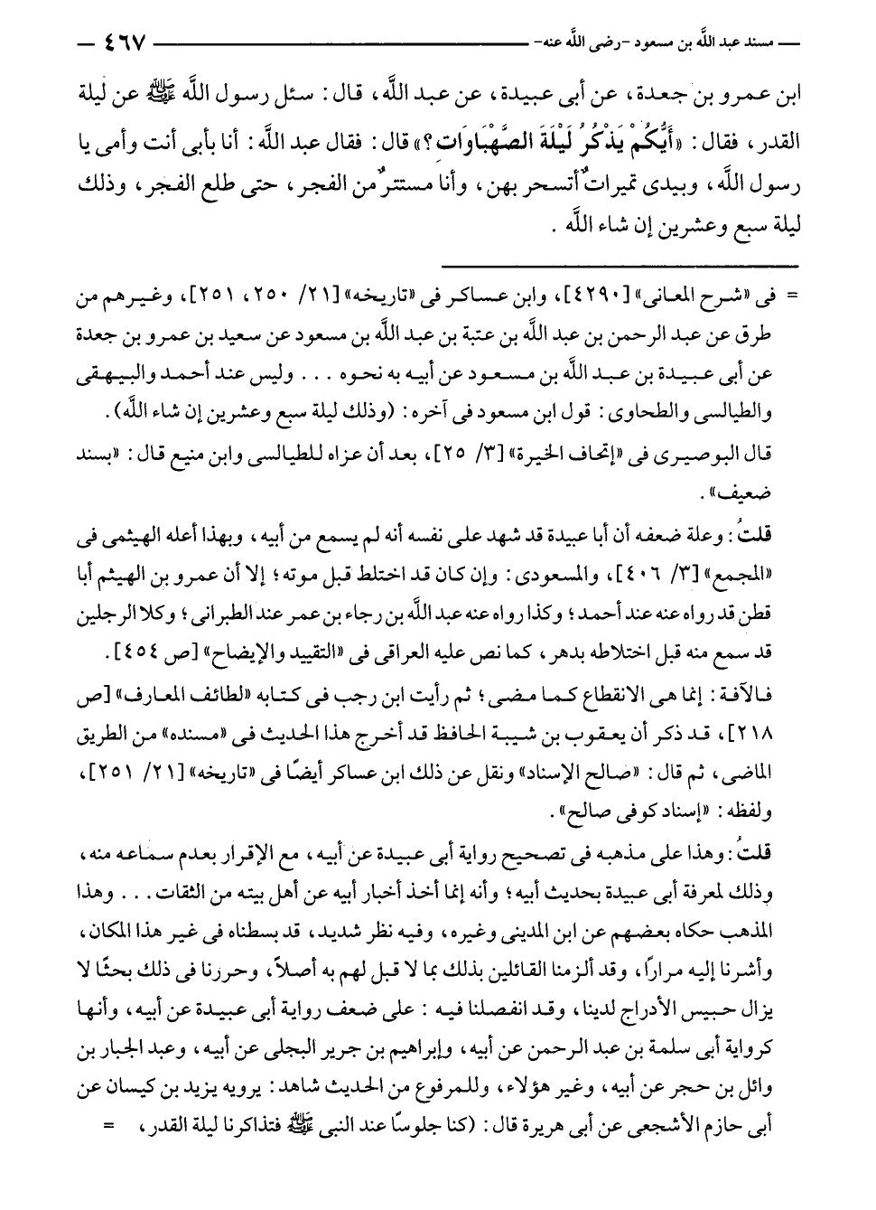 قلتُ: وهذا على مذهبه في تصحيح رواية أبى عبيدة عن أبيه، مع الإقرار بعدم سماعه منه، وذلك لمعرفة أبى عبيدة بحديث أبيه؛ وأنه إنما أخذ أخبار أبيه عن أهل بيته من الثقات ... وهذا المذهب حكاه بعضهم عن ابن المدينى وغيره، وفيه نظر شديد، قد بسطناه في غير هذا المكان، وأشرنا إليه مرارًا، وقد ألزمنا القائلين بذلك بما لا قبل لهم به أصلًا، وحررنا في ذلك بحثًا لا يزال حبيس الأدراج لدينا، وقد انفصلنا فيه: على ضعف رواية أبى عبيدة عن أبيه، وأنها كرواية أبي سلمة بن عبد الرحمن عن أبيه، وإبراهيم بن جرير البجلى عن أبيه، وعبد الجبار بن وائل بن حجر عن أبيه، وغير هؤلاء، وللمرفوع من الحديث شاهد: يرويه يزيد بن كيسان عن أبى حازم الأشجعى عن أبى هريرة قال: (كنا جلوسًا عند النبي - صلى الله عليه وسلم - فتذاكرنا ليلة القدر،=