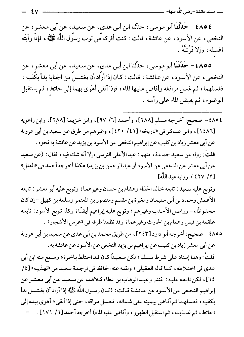 ٤٨٥٥ - حَدَّثَنَا أبو موسى، حدّثنا ابن أبى عدى، عن سعيد، عن أبى معشرٍ، عن النخعى، عن الأسود، عن عائشة، قالت: كان إذا أراد أن يغتسل من الجنابة بدأ بكفيه، فغسلهما، ثم غسل مرافقه وأفاض عليها الماء، فإذا أنقى أهوى بهما إلى حائطٍ، ثم يستقبل الوضوء، ثم يفيض الماء على رأسه.