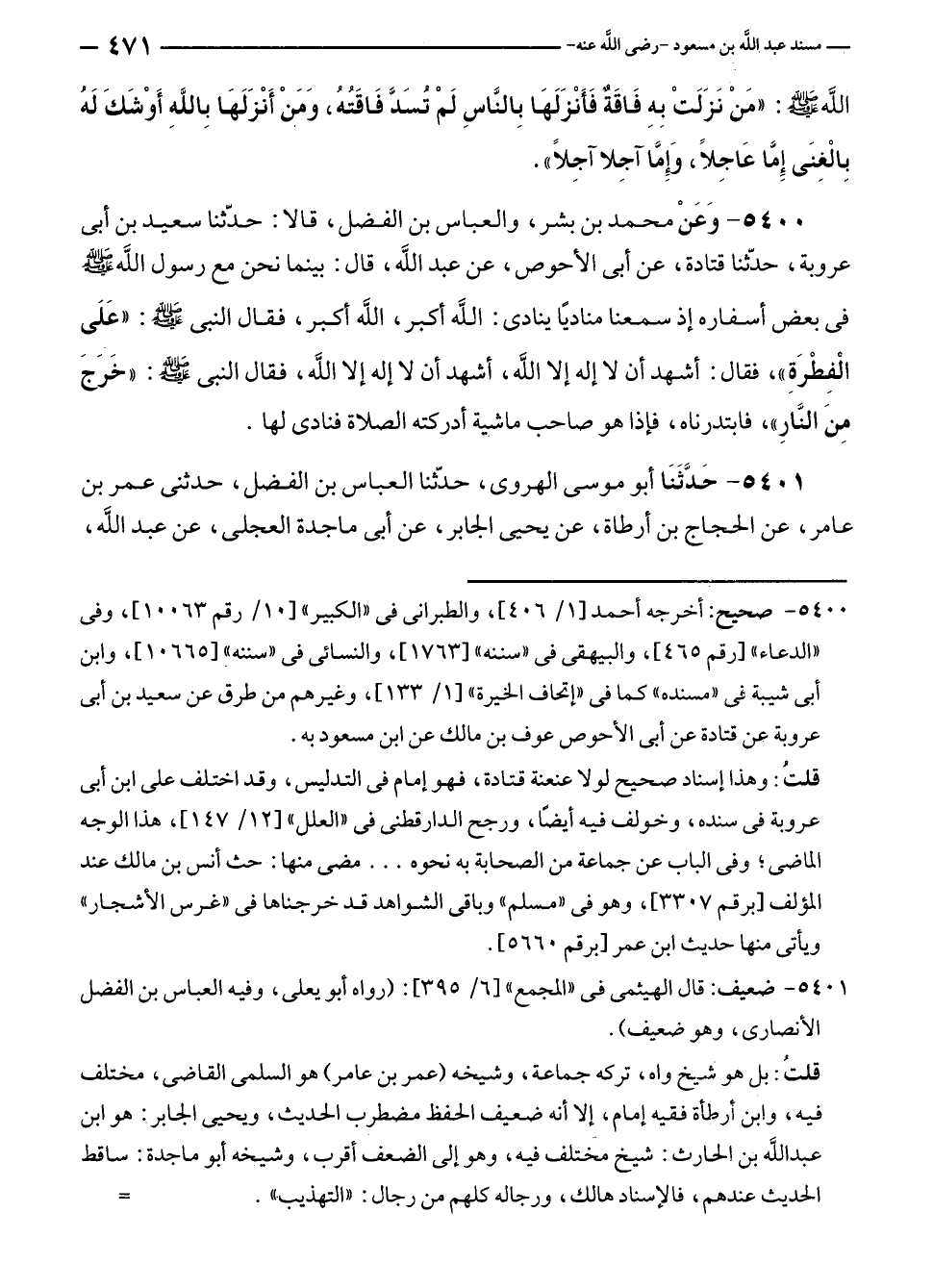 ٥٤٠١ - صحيح: أخرجه أحمد [١/ ٤٠٦]، والطبرانى في "الكبير" [١٠/ رقم ١٠٠٦٣]، وفى "الدعاء" [رقم ٤٦٥]، والبيهقى في "سننه" [١٧٦٣]، والنسائى في "سننه" [١٠٦٦٥]، وابن أبى شيبة في "مسنده" كما في "إتحاف الخيرة" [١/ ١٣٣]، وغيرهم من طرق عن سعيد بن أبى عروبة عن قتادة عن أبى الأحوص عوف بن مالك عن ابن مسعود به.