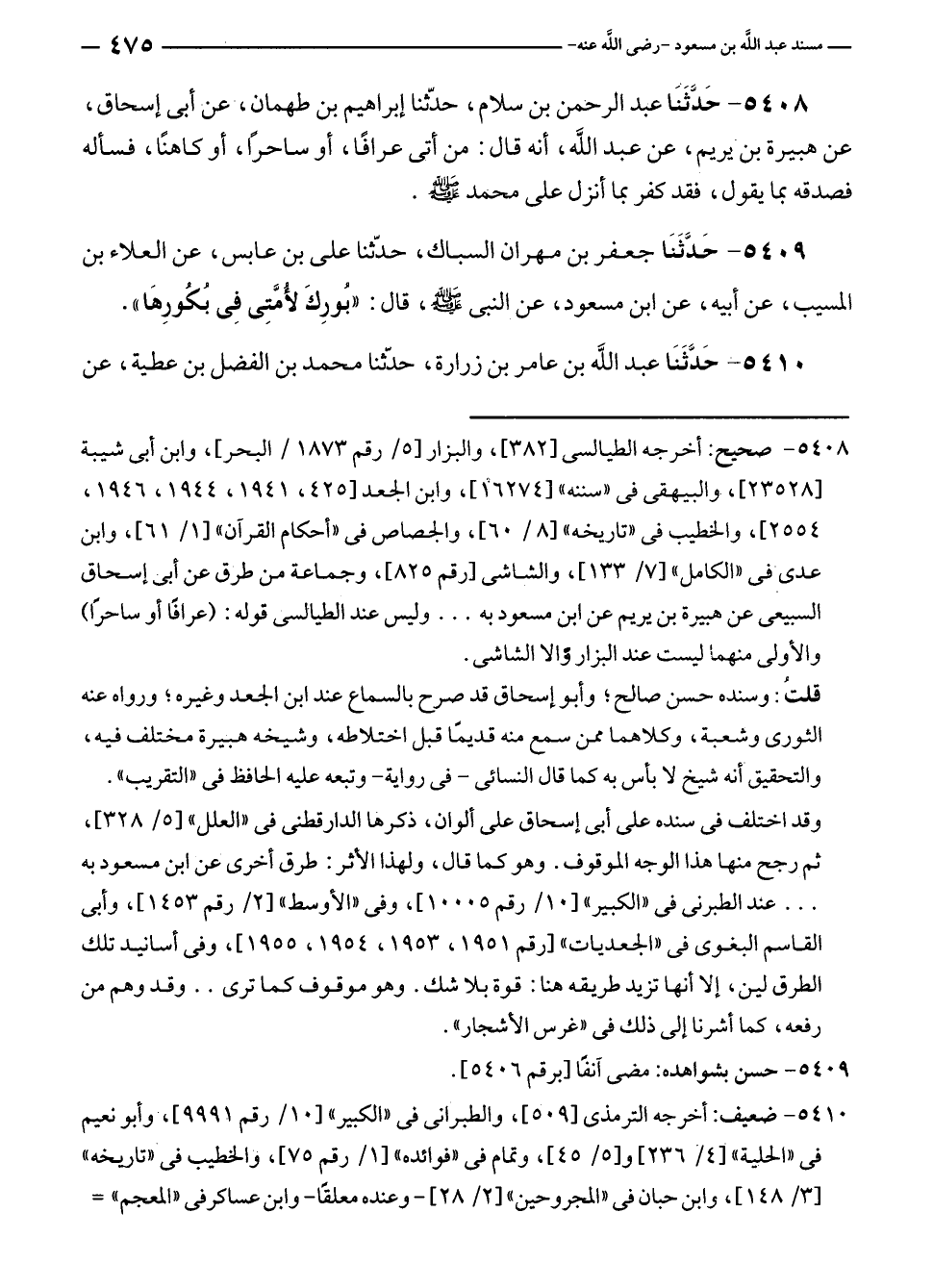 ٥٤٠٨ - حَدَّثَنَا عبد الرحمن بن سلام، حدّثنا إبراهيم بن طهمان، عن أبى إسحاق، عن هبيرة بن بريم، عن عبد الله، أنه قال: من أتى عرافًا، أو ساحرًا، أو كاهنًا، فسأله فصدقه بما يقول، فقد كفر بما أنزل على محمد - صلى الله عليه وسلم -.