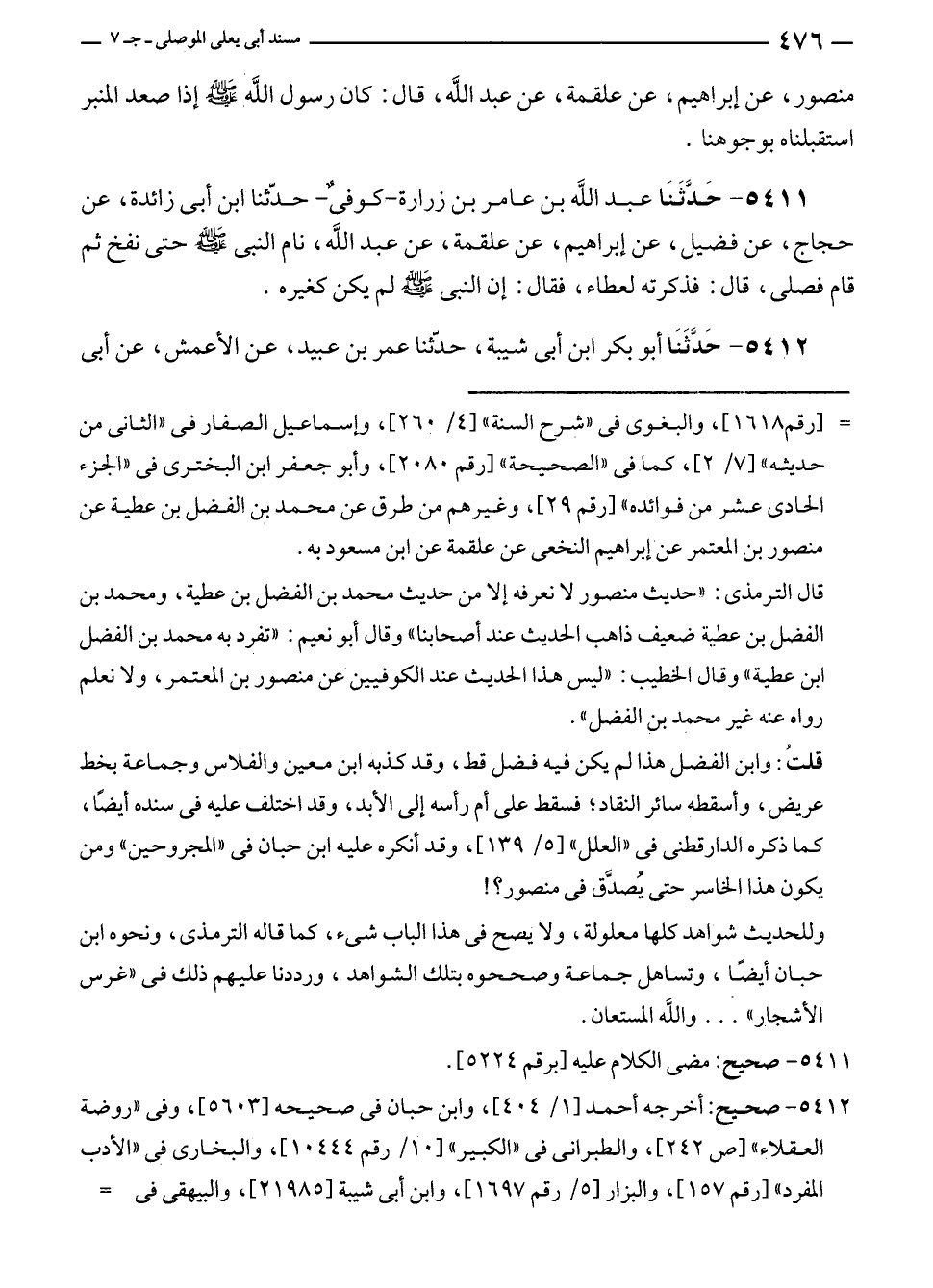 = [رقم ١٦١٨]، والبغوى في "شرح السنة" [٤/ ٢٦٠]، وإسماعيل الصفار في "الثاني من حديثه" [٧/ ٢]، كما في "الصحيحة" [رقم ٢٠٨٠]، وأبو جعفر بن البخترى في "الجزء الحادى عشر من فوائده" [رقم ٢٩]، وغيرهم من طرق عن محمد بن الفضل بن عطية عن منصور بن المعتمر عن إبراهيم النخعى عن علقمة عن ابن مسعود به.