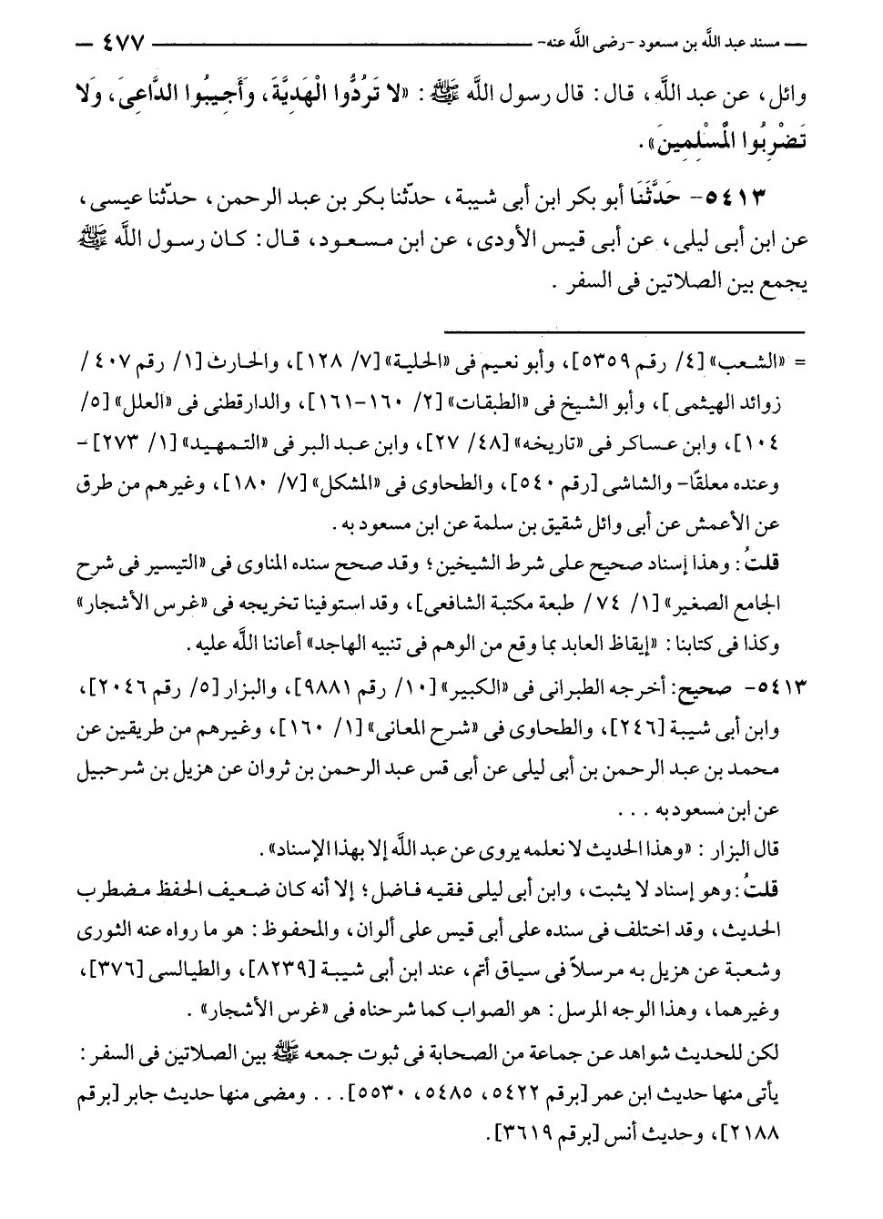 ٥٤١٣ - حَدَّثَنَا أبو بكر بن أبى شيبة، حدّثنا بكر بن عبد الرحمن، حدّثنا عيسى، عن ابن أبى ليلي، عن أبى قيس الأودى، عن ابن مسعود، قال: كان رسول الله - صلى الله عليه وسلم - يجمع بين الصلاتين في السفر.