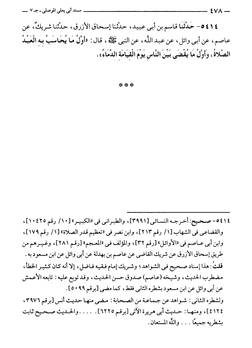 ٥٤١٤ - حَدَّثَنَا قاسم بن أبى عبيد، حدّثنا إسحاق الأزرق، حدّثنا شريكٌ، عن عاصم، عن أبى وائل، عن عبد الله، عن النبي - صلى الله عليه وسلم -، قال: "أَوَّلُ مَا يُحَاسَبُ بِهِ الْعَبْدُ الصَّلاةُ، وَأَوَّلُ مَا يُقْضَى بَيْنَ النَّاسِ يَوْمَ الْقِيَامَةِ الدِّمَاءُ".