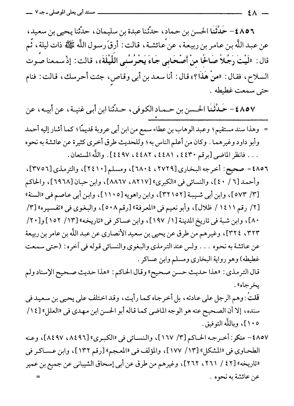 ٤٨٥٦ - حَدَّثَنَا الحسن بن حمادٍ، حدّثنا عبدة بن سليمان، حدّثنا يحيى بن سعيدٍ، عن عبد الله بن عامر بن ربيعة، عن عائشة، قالت: أرِقَ رسول الله - صلى الله عليه وسلم - ذات ليلةٍ، ثم قال: "لَيْتَ رَجُلًا صَالِحًا مِنْ أَصْحَابِى جَاءَ يَحْرُسُنِى اللَّيْلَةَ"، قالت: إذْ سمعنا صوت السلاح، فقال: "منْ هَذَا؟ " قال: أنا سعد بن أبى وقاصٍ، جئت أحرسك، قالت: فنام حتى سمعت غطيطه.