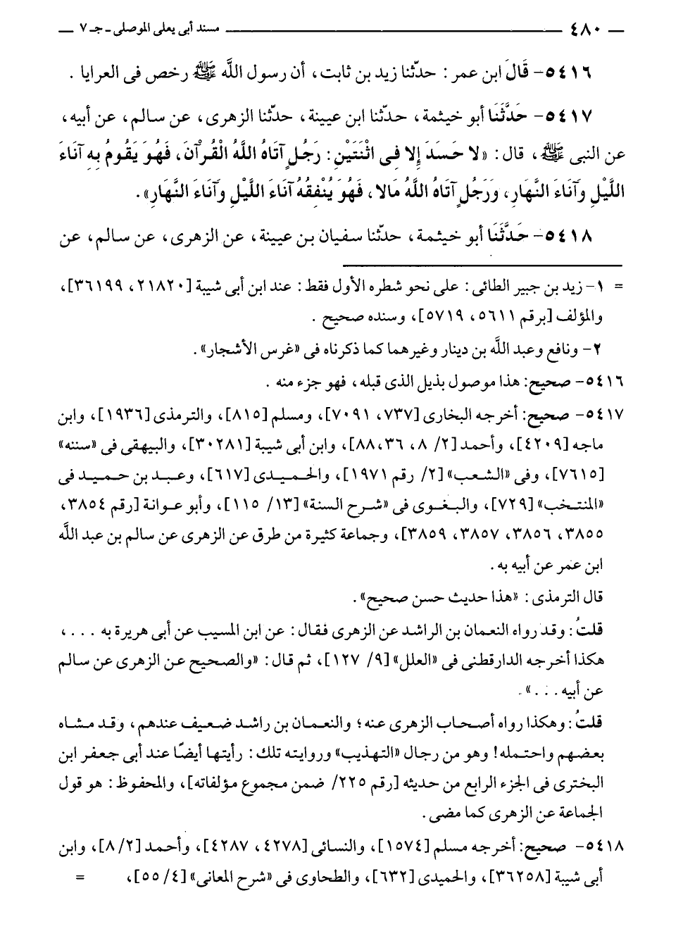 ٥٤١٧ - حَدَّثَنَا أبو خيثمة، حدّثنا ابن عيينة، حدّثنا الزهرى، عن سالم، عن أبيه، عن النبي - صلى الله عليه وسلم -، قال: "لا حَسَدَ إلا فِي اثْنَتَيْنِ: رَجُلٍ آتَاهُ اللَّهُ الْقُرْآنَ، فَهُوَ يَقُومُ بِهِ آنَاءَ اللَّيْلِ وَآنَاءَ النَّهَارِ، وَرَجُلٍ آتَاهُ اللَّهُ مَالًا، فَهُوَ يُنْفِقُهُ آنَاءَ اللَّيْلِ وَآنَاءَ النَّهَارِ".