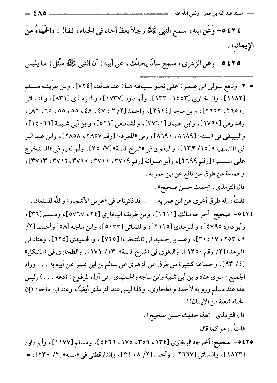 ٥٤٢٤ - صحيح: أخرجه مالك [١٦١١]، ومن طريقه البخارى [٢٤، ٥٧٦٧]، ومسلم [٣٦]، وأبو داود ٤٧٩٥]، والترمذى [٢٦١٥]، والنسائى [٥٠٣٣]، وابن ماجه [٥٨] وأحمد [٢/ ٩، ٢٥٣، ٣٠٤١٧]، وعبد بن حميد في "المنتخب" [٧٢٥]، والحميدى [٦٢٥]، وهناد في "الزهد" [٢/ رقم ١٣٥٠]، والبغوى في "شرح السنة" [١٣/ ١٧١]، والطحاوى في "المشكل" [٤/ ٩٣]، وجماعة كثيرة من طرق عن الزهرى عن سالم بن ابن عمر عن أبيه به ... وزاد الجميع - سوى هناد وابن أبى شيبة وابن ماجه والحميدى - في أول المرفوع: (دعه ... ) وليس هذا عند مسلم ورواية لأحمد والطحاوى، وكذا ليس عند الترمذى أيضًا، وعند ابن ماجه: (إن الحياء شعبة من الإيمان)!.