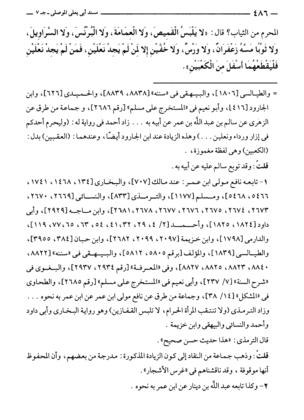 = والطيالسى [١٨٠٦]، والبيهقى في "سننه" [٨٨٣٨، ٨٨٣٩]، والحميدى [٦٢٦]، وابن الجارود [٤١٦]، وأبو نعيم في "المستخرج على مسلم" [رقم ٢٦٨٦]، وجماعة من طرق عن الزهرى عن سالم بن عبد الله بن عمر عن أبيه به ... زاد أحمد في رواية له: (وليحرم أحدكم في إزار ورداء ونعلين ... ) وهذه الزيادة عند ابن الجارود أيضًا، وعندهما: (العقبين) بدل: (الكعبين) وهى لفظة مغموزة.