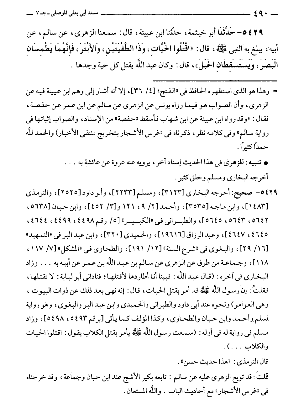 ٥٤٢٩ - حَدَّثَنَا أبو خيثمة، حدّثنا ابن عيينة، قال: سمعنا الزهرى، عن سالم، عن أبيه، يبلغ به النبي - صلى الله عليه وسلم -، قال: "اقْتُلُوا الحيَّاتِ، وَذَا الطُّفْيَتَيْنِ، وَالأَبْتَرَ، فَإِنهمَا يَطْمِسَانِ الْبَصَرَ، وَيَسْتَسْقِطَانِ الحبَلَ"، قال: وكان عبد الله يقتل كل حية وجدها.