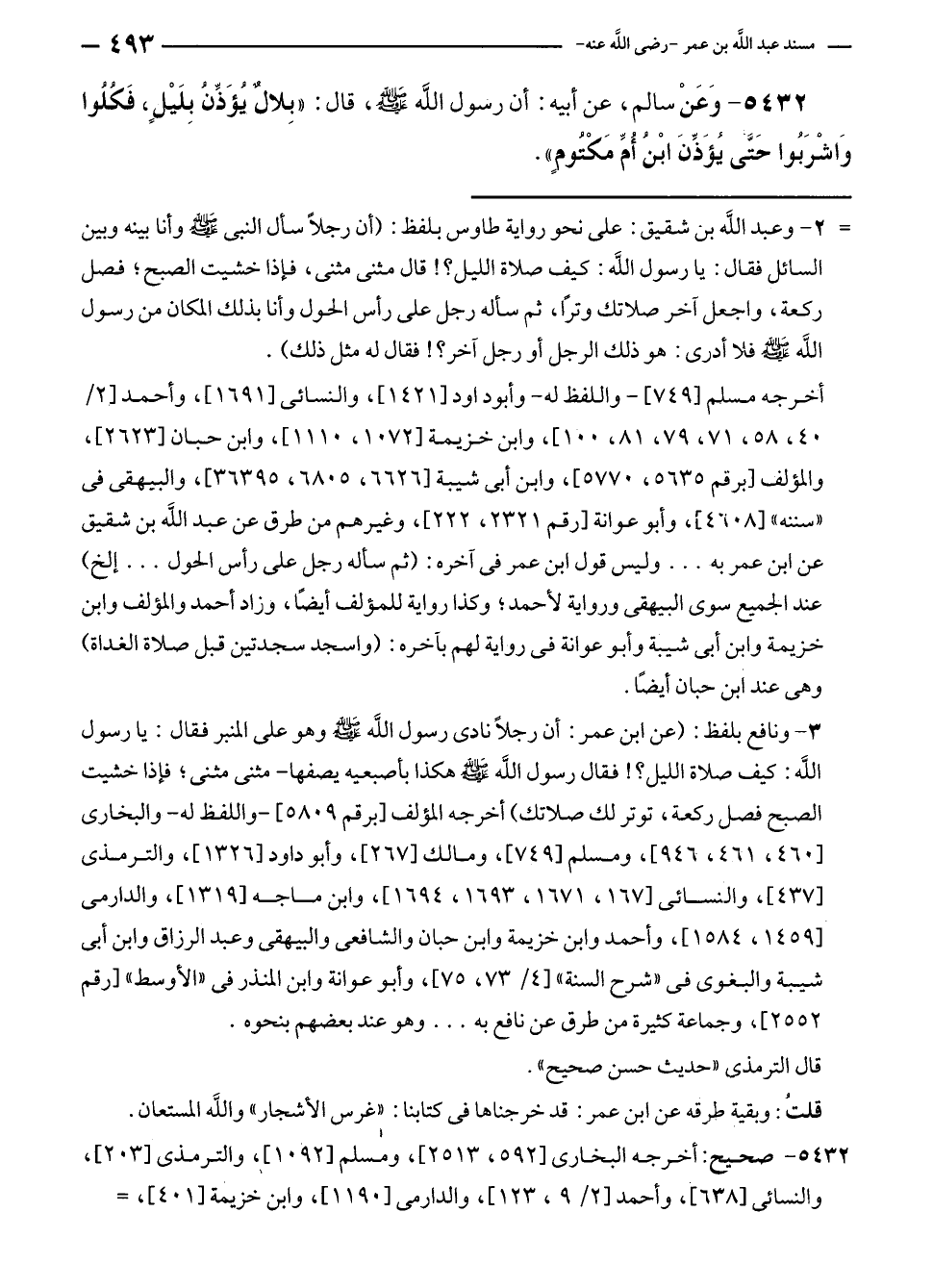 ٥٤٣٢ - صحيح: أخرجه البخارى [٥٩٢، ٢٥١٣]، ومسلم [١٠٩٢]، والترمذى [٢٠٣]، والنسائى [٦٣٨]، وأحمد [٢/ ٩، ١٢٣]، والدارمى [١١٩٠]، وابن خزيمة [٤٠١]،=