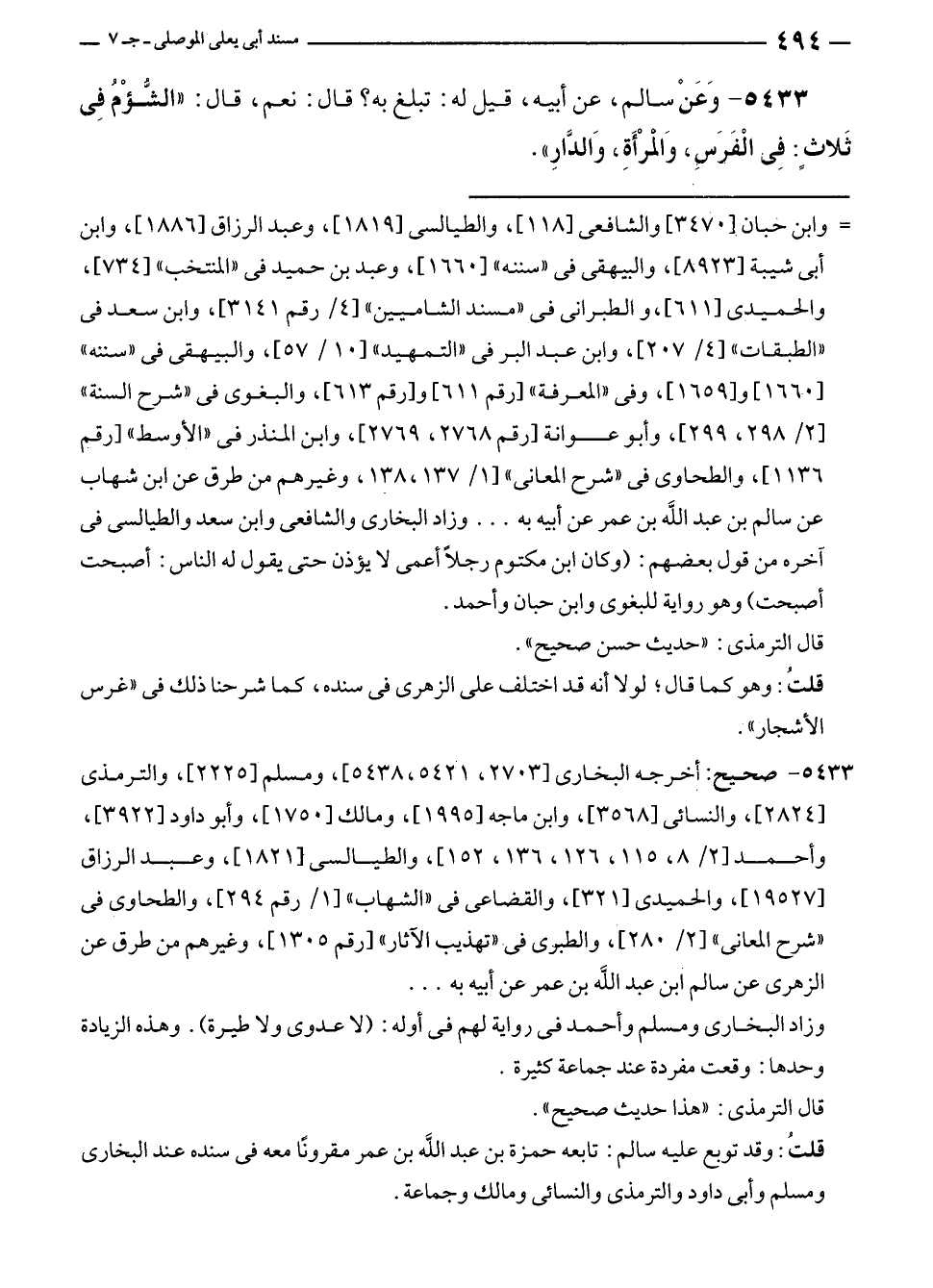 ٥٤٣٣ - وَعَنْ سالم، عن أبيه، قيل له: تبلغ به؟ قال: نعم، قال: "الشُّؤْمُ فِي ثَلاثٍ: فِي الْفَرَسِ، وَالمرْأَةِ، وَالدَّارِ".