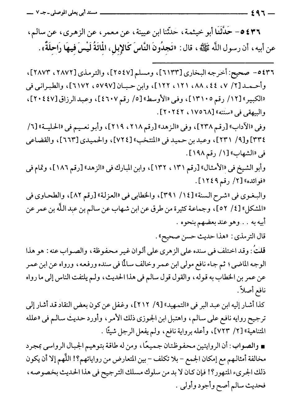٥٤٣٦ - حَدَّثَنَا أبو خيثمة، حدّثنا ابن عيينة، عن معمر، عن الزهرى، عن سالم، أبيه، أن رسول الله - صلى الله عليه وسلم -، قال: "تَجِدُونَ النَّاسَ كَالإِبِلِ، المائَةُ لَيْسَ فِيهَا رَاحِلَةٌ".