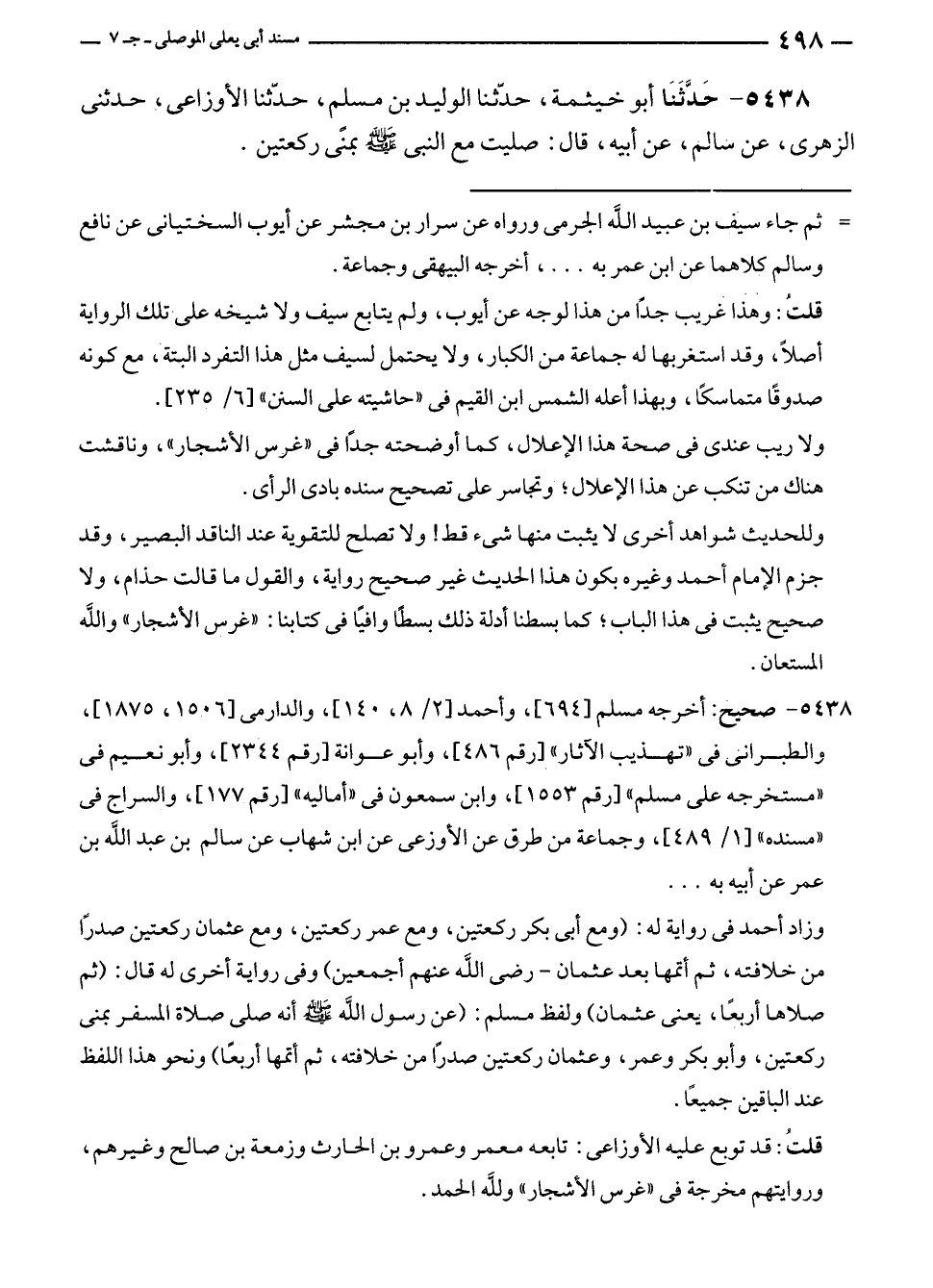 ٥٤٣٨ - حَدَّثَنَا أبو خيثمة، حدّثنا الوليد بن مسلمٍ، حدّثنا الأوزاعى، حدثنى الزهرى، عن سالم، عن أبيه، قال: صليت مع النبي - صلى الله عليه وسلم - بمنى ركعتين.