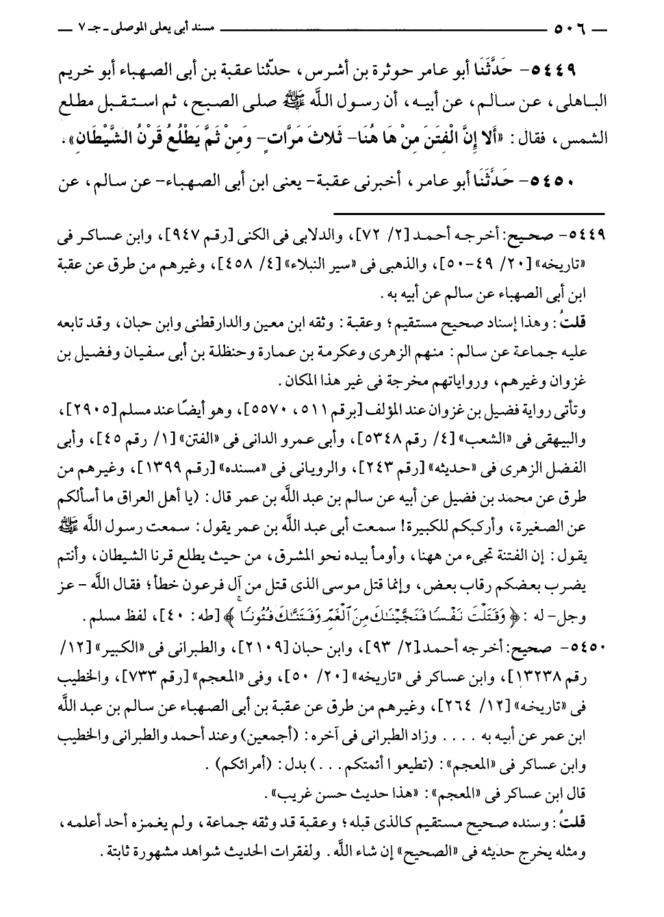 ٥٤٤٩ - حَدَّثَنَا أبو عامر حوثرة بن أشرس، حدّثنا عقبة بن أبى الصهباء أبو خريم الباهلى، عن سالم، عن أبيه، أن رسول الله - صلى الله عليه وسلم - صلى الصبح، ثم استقبل مطلع الشمس، فقال: "أَلا إِنَّ الْفِتَنَ مِنْ هَا هُنَا - ثَلاثَ مَرَّاتٍ - وَمِنْ ثَمَّ يَطْلُعُ قَرْنُ الشَّيْطَانِ".