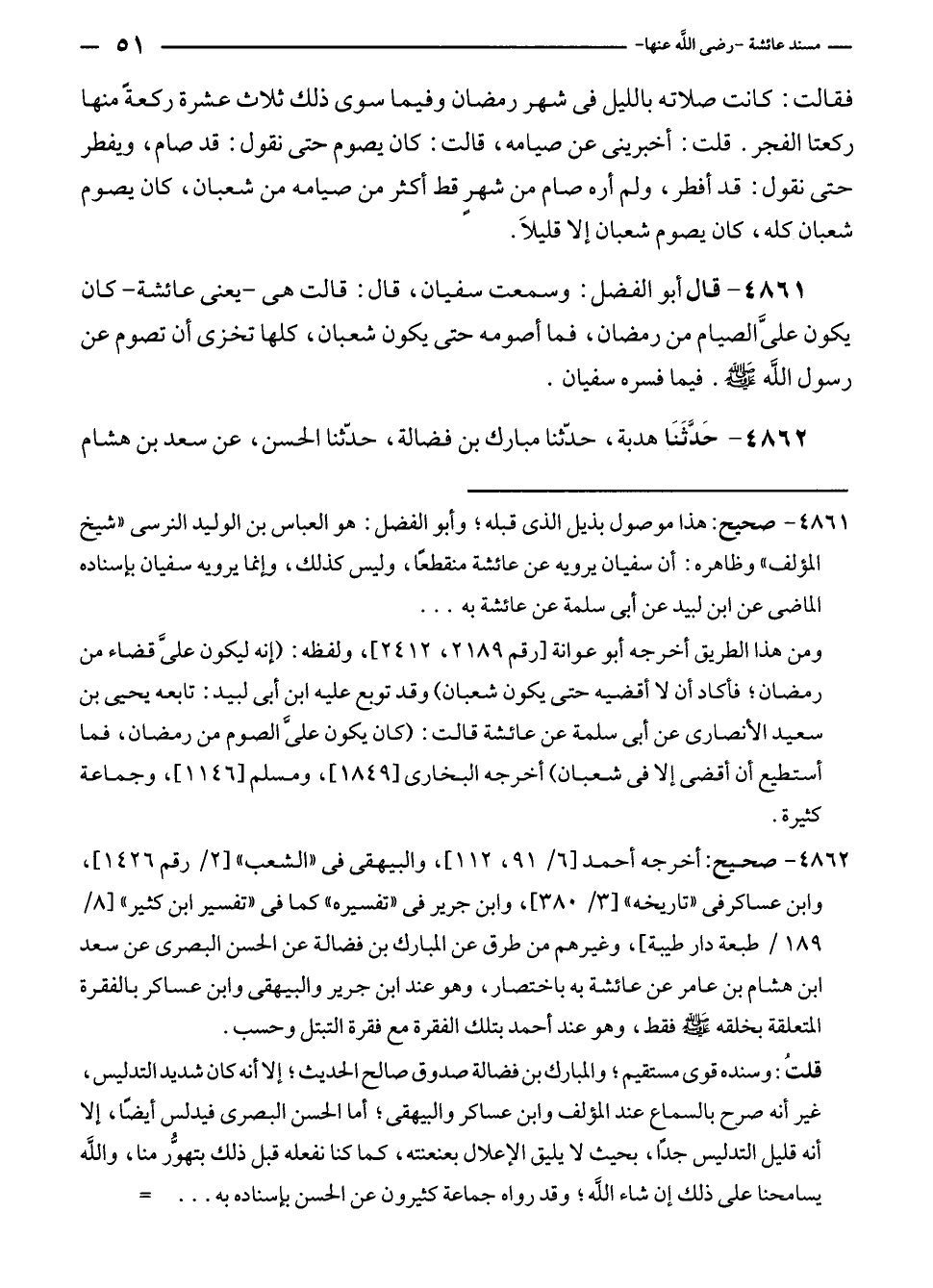 ٤٨٦١ - قال أبو الفضل: وسمعت سفيان، قال: قالت هي - يعنى عائشة - كان يكون عليَّ الصيام من رمضان، فما أصومه حتى يكون شعبان، كلها تخزى أن تصوم عن رسول الله - صلى الله عليه وسلم -. فيما فسره سفيان.