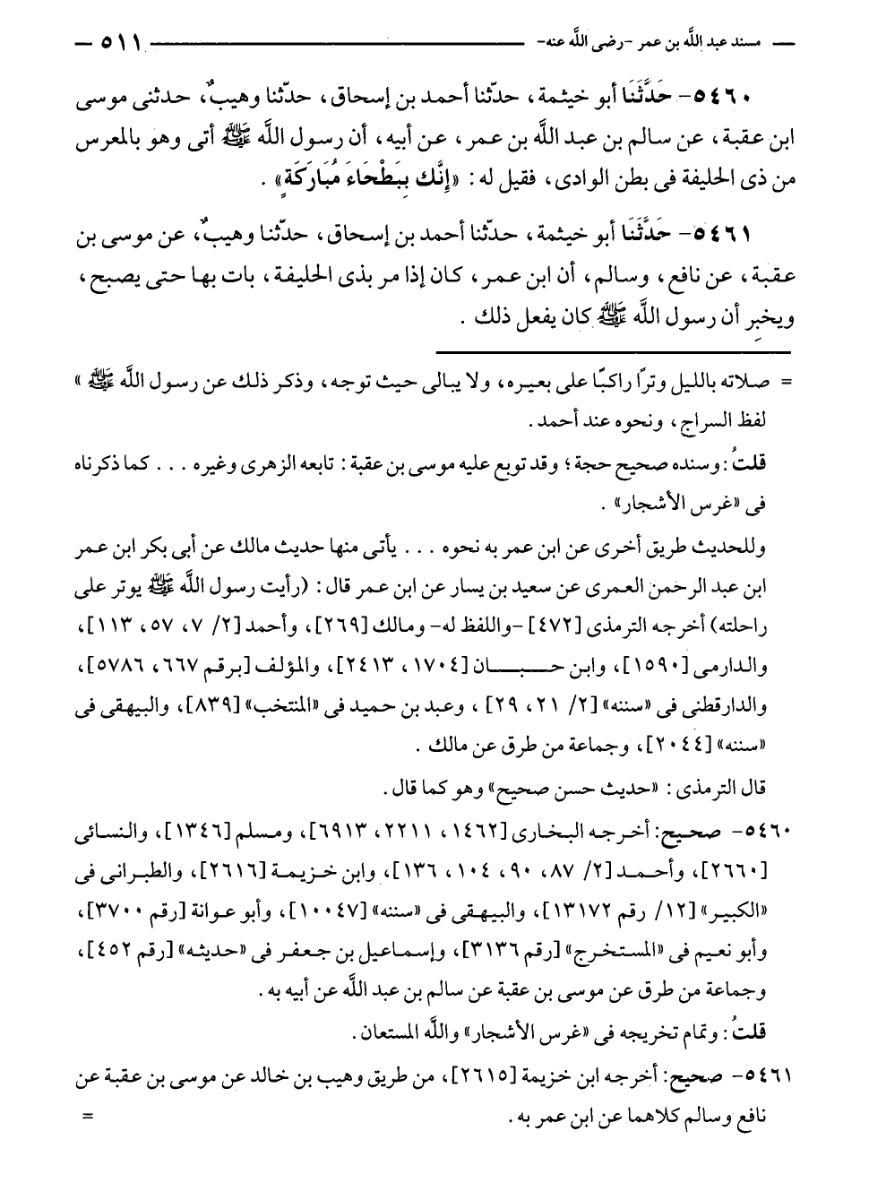 ٥٤٦١ - حدَّثَنَا أبو خيثمة، حدّثنا أحمد بن إسحاق، حدّثنا وهيبٌ، عن موسى بن عقبة، عن نافع، وسالم، أن ابن عمر، كان إذا مر بذى الحليفة، بات بها حتى يصبح، ويخبِر أن رسول الله - صلى الله عليه وسلم - كان يفعل ذلك.