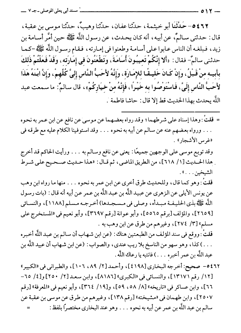 ٥٤٦٢ - حَدَّثَنَا أبو خيثمة، حدّثنا عفان، حدّثنا وهيبٌ، حدّثنا موسى بن عقبة، قال: حدثنى سالمٌ، عن أبيه، أنه كان يحدث، عن رسول الله - صلى الله عليه وسلم - حين أمَّر أسامة بن زيد، فبلغه أن الناس عابوا على أسامة وطعنوا في إمارته، فقام رسول الله - صلى الله عليه وسلم - - كما حدثنى سالمٌ - فقال: "أَلا إِنَّكُمْ تَعِيبُونَ أُسَامَةَ، وتَطْعَنُونَ فِي إِمَارَتِه، وَقَدْ فَعَلْتُمْ ذَلِكَ بِأَبِيهِ مِنْ قَبلُ، وَإِنْ كَانَ خَلِيقًا لِلإِمَارَةِ، وَإِنَّهُ لأَحَبُّ النَّاسِ إِليَّ كُلِّهِمْ، وَإِنَّ ابْنَهُ هَذَا لأَحَبُّ النَّاسِ إِلَيَّ، فَاسْتَوْصُوا بِهِ خَيْرًا، فَإِنَّهُ مِنْ خِيَارِكُمْ"، قال سالم: ما سمعت عبد الله يحدث بهذا الحديث قط إلا قال: حاشا فاطمة.