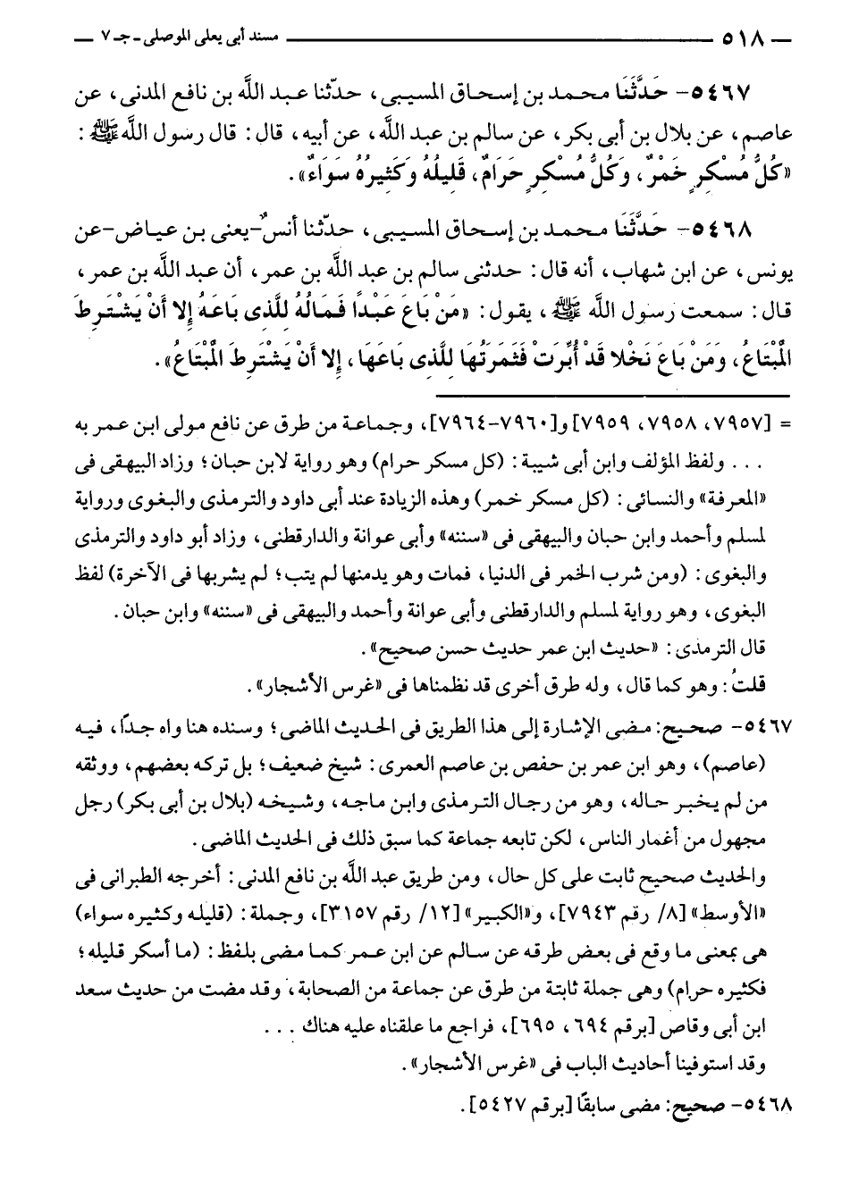 ٥٤٦٧ - حَدَّثَنَا محمد بن إسحاق المسيبى، حدّثنا عبد الله بن نافع المدنى، عن عاصم، عن بلال بن أبى بكر، عن سالم بن عبد الله، عن أبيه، قال: قال رسول الله - صلى الله عليه وسلم -: "كُلُّ مُسْكِرٍ خَمْرٌ، وَكُلُّ مُسْكِرٍ حَرَامٌ، قَلِيلُهُ وَكَثِيرهُ سَوَاءٌ".