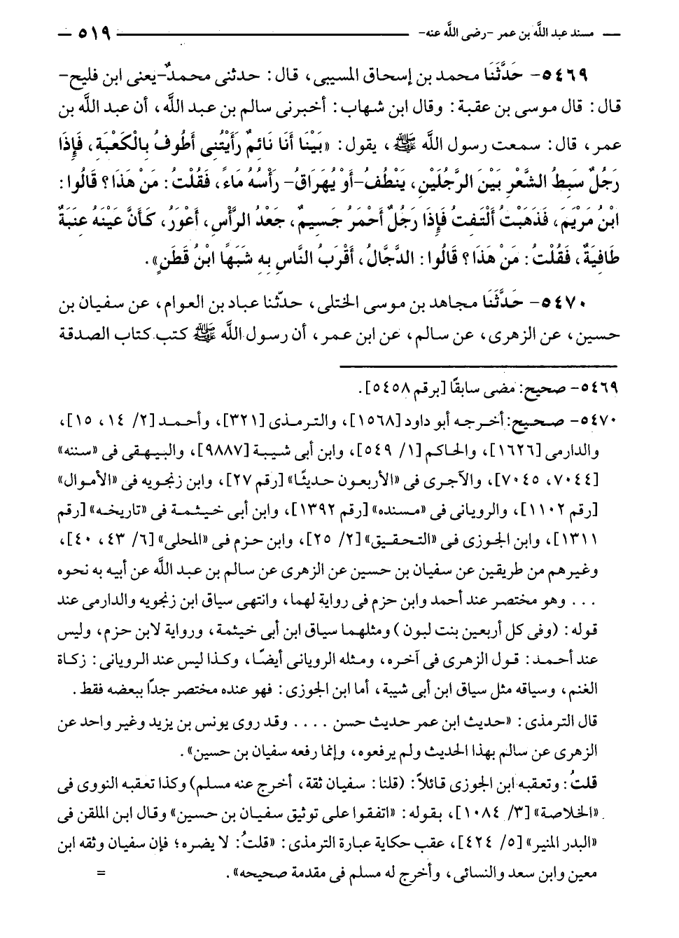 ٥٤٧٠ - حَدَّثَنَا مجاهد بن موسى الختلى، حدّثنا عباد بن العوام، عن سفيان بن حسين، عن الزهرى، عن سالم، عن ابن عمر، أن رسول الله - صلى الله عليه وسلم -. كتاب الصدقة