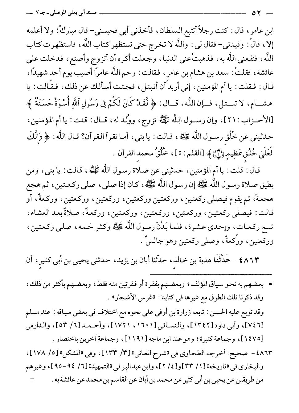 ابن عامر، قال: كنت رجلًا أتتبع السلطان، فأخذنى أبى فحبسنى - قال مباركٌ: ولا أعلمه إلا، قال: وقيدنى - فقال لى: واللَّه لا تخرج حتى تستظهر كتاب الله، فاستظهرت كتاب الله، فنفعنى الله به، فذهبتْ عنى الدنيا، وجعلت أكره أن أتزوج وأصنع، فدخلت على عائشة، فقلتُ: سعد بن هشام بن عامرٍ، فقالت: رحم الله عامرًا أصيب يوم أحد شهيدًا، قال: فقلت: يا أم المؤمنين، إنى أريد أن أتبتل، فجئت أسألك عن ذلك، فقالت: يا هشام، لا تبتل، فإن الله، قال: {لَقَدْ كَانَ لَكُمْ فِي رَسُولِ اللَّهِ أُسْوَةٌ حَسَنَةٌ} [الأحزاب: ٢١]، وإن رسول الله - صلى الله عليه وسلم - تزوج، ووُلد له، قال: قلت: يا أم المؤمنين، حدثينى عن خُلُقِ رسول الله - صلى الله عليه وسلم -، قالت: يا بنى، أما تقرأ القرآن؟ قال الله: {وَإِنَّكَ لَعَلَى خُلُقٍ عَظِيمٍ (٤)} [القلم: ٤]، خُلُقُ محمدٍ القرآن.