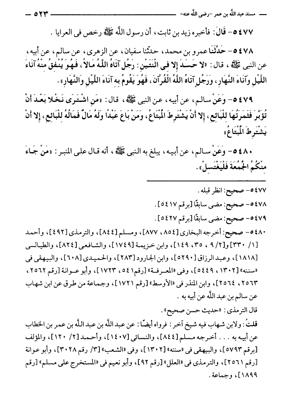٥٤٨٠ - صحيح: أخرجه البخارى [٨٥٤، ٨٧٧]، ومسلم [٨٤٤]، والترمذى [٤٩٢]، وأحمد [١/ ٣٣٥] و [٢/ ٩، ٣٥، ١٤٩]، وابن خزيمة [١٧٤٩]، والشافعى [٨٢٤]، والطيالسى [١٨١٨]، وعبد الرزاق [٥٢٩٠]، وابن الجارود [٢٨٣]، والحميدى [٦٠٨]، والبيهقى في "سننه" [١٣٠٢، ٥٤٤٩]، وفى "المعرفة" [رقم ٥٤١، ١٧٢٣]، وأبو عوانة [رقم ٢٥٦٢، ٢٥٦٣، ٢٥٦٤]، وابن المنذر في "الأوسط" [رقم ١٧٢١]، وجماعة من طرق عن ابن شهاب عن سالم بن عبد الله عن أبيه به.