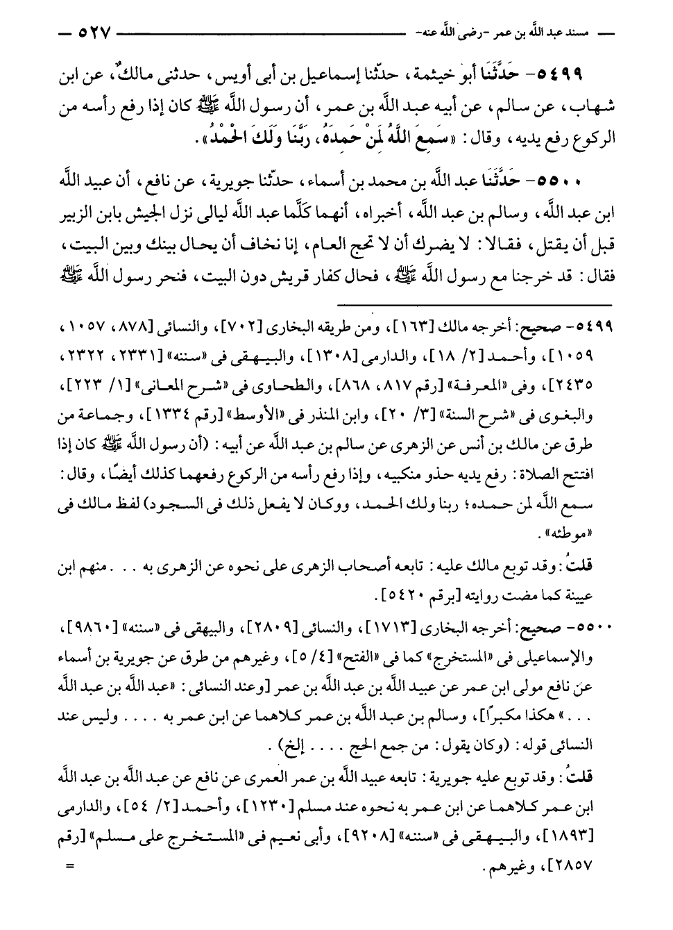 ٥٤٩٩ - صحيح: أخرجه مالك [١٦٣]، ومن طريقه البخارى [٧٠٢]، والنسائى [٨٧٨، ١٠٥٧، ١٠٥٩]، وأحمد [٢/ ١٨]، والدارمى [١٣٠٨]، والبيهقى في "سننه" [٢٣٣١، ٢٣٢٢، ٢٤٣٥]، وفى "المعرفة" [رقم ٨١٧، ٨٦٨]، والطحاوى في "شرح المعانى" [١/ ٢٢٣]، والبغوى في "شرح السنة" [٣/ ٢٠]، وابن المنذر في "الأوسط" [رقم ١٣٣٤]، وجماعة من طرق عن مالك بن أنس عن الزهرى عن سالم بن عبد الله عن أبيه: (أن رسول الله - صلى الله عليه وسلم - كان إذا افتتح الصلاة: رفع يديه حذو منكبيه، وإذا رفع رأسه من الركوع رفعهما كذلك أيضًا، وقال: سمع الله لمن حمده؛ ربنا ولك الحمد، وكان لا يفعل ذلك في السجود) لفظ مالك في "موطئه".