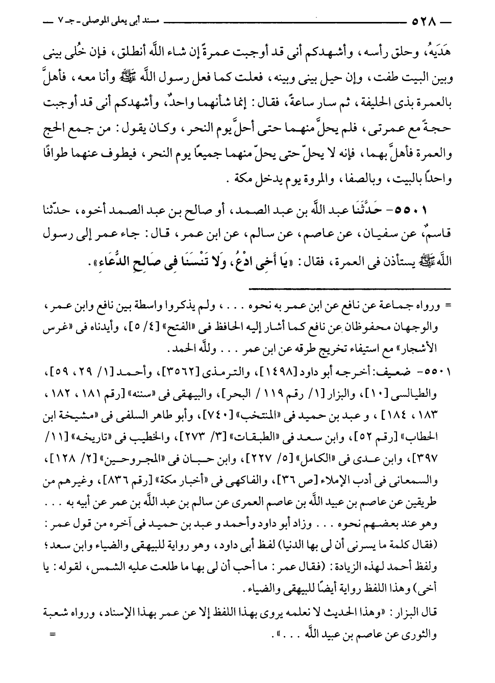 ٥٥٠١ - ضعيف: أخرجه أبو داود [١٤٩٨]، والترمذى [٣٥٦٢]، وأحمد [١/ ٢٩، ٥٩]، والطيالسى [١٠]، والبزار [١/ رقم ١١٩/ البحر]، والبيهقى في "سننه" [رقم ١٨١، ١٨٢، ١٨٣، ١٨٤]، وعبد بن حميد في "المنتخب" [٧٤٠]، وأبو طاهر السلفى في "مشيخة ابن الحطاب" [رقم ٥٢]، وابن سعد في "الطبقات" [٣/ ٢٧٣]، والخطيب في "تاريخه" [١١/ ٣٩٧]، وابن عدى في "الكامل" [٥/ ٢٢٧]، وابن حبان في "المجروحين" [٢/ ١٢٨]، والسمعانى في أدب الإملاء [ص ٣٦]، والفاكهى في "أخبار مكة" [رقم ٨٣٦]، وغيرهم من طريقين عن عاصم بن عبيد الله بن عاصم العمرى عن سالم بن عبد الله بن عمر عن أبيه به ...