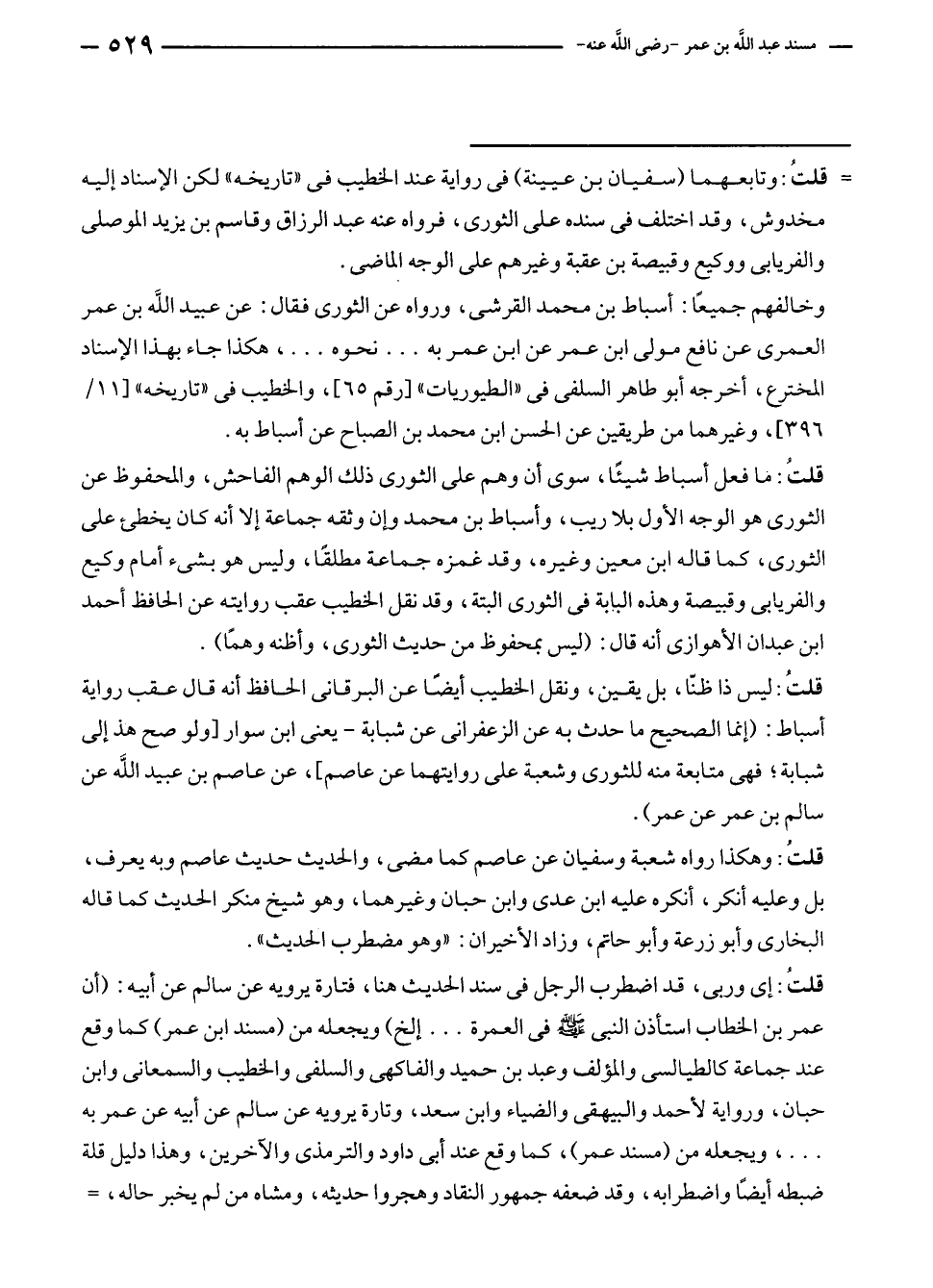 قلتُ: ليس ذا ظنّا، بل يقين، ونقل الخطيب أيضًا عن البرقانى الحافظ أنه قال عقب رواية أسباط: (إنما الصحيح ما حدث به عن الزعفرانى عن شبابة - يعنى ابن سوار [ولو صح هذا إلى شبابة؛ فهى متابعة منه للثورى وشعبة على روايتهما عن عاصم]، عن عاصم بن عبيد الله عن سالم بن عمر عن عمر).