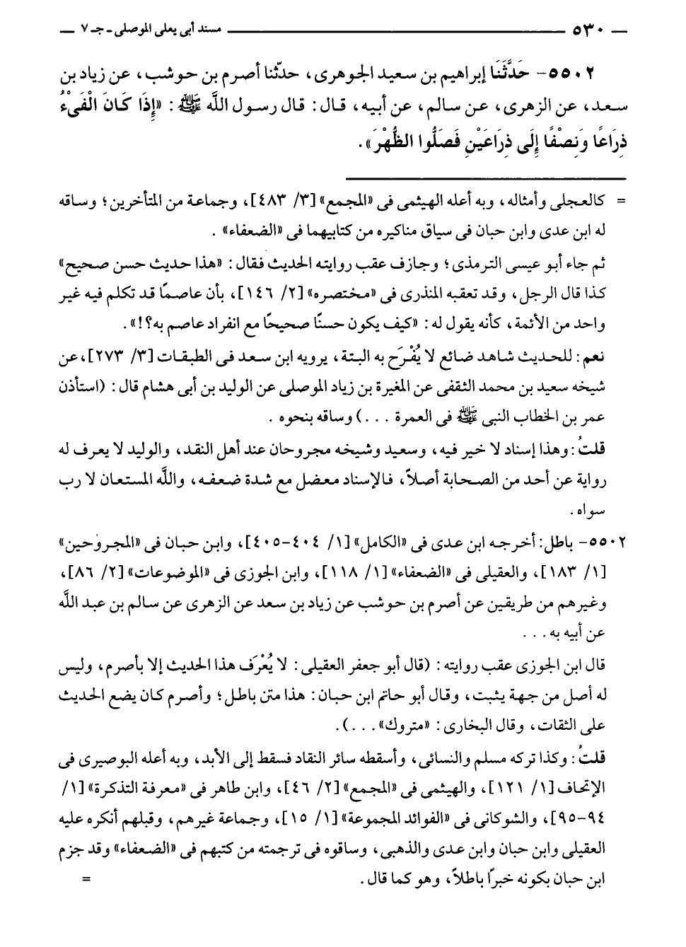 ٥٥٠٢ - حَدَّثَنَا إبراهيم بن سعيد الجوهرى، حدّثنا أصرم بن حوشب، عن زياد بن سعد، عن الزهرى، عن سالم، عن أبيه، قال: قال رسول الله - صلى الله عليه وسلم -: "إِذَا كَانَ الْفَىْءُ ذِرَاعًا وَنِصْفًا إِلَى ذِرَاعَيْنِ فَصَلُّوا الظُّهْرَ".