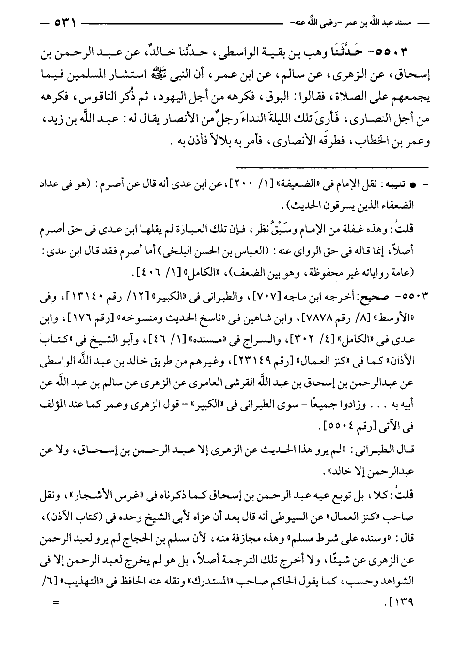 ٥٥٠٣ - صحيح: أخرجه ابن ماجه [٧٠٧]، والطبرانى في "الكبير" [١٢/ رقم ١٣١٤٠]، وفى "الأوسط" [٨/ رقم ٧٨٧٨]، وابن شاهين في "ناسخ الحديث ومنسوخه" [رقم ١٧٦]، وابن عدى في "الكامل" [٤/ ٣٠٢]، والسراج في "مسنده" [١/ ٤٦]، وأبو الشيخ في "كتاب الأذان" كما في "كنز العمال" [رقم ٢٣١٤٩]، وغيرهم من طريق خالد بن عبد الله الواسطى عن عبد الرحمن بن إسحاق بن عبد الله القرشى العامرى عن الزهرى عن سالم بن عبد الله عن أبيه به ... وزادوا جميعًا - سوى الطبراني في "الكبير" - قول الزهرى وعمر كما عند المؤلف في الآتى [رقم ٥٥٠٤].