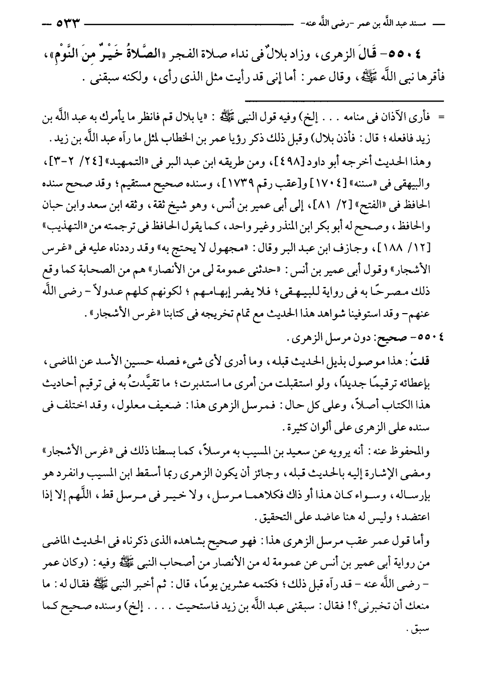 وأما قول عمر عقب مرسل الزهرى هذا: فهو صحيح بشاهده الذي ذكرناه في الحديث الماضى من رواية أبى عمير بن أنس عن عمومة له من الأنصار من أصحاب النبي - صلى الله عليه وسلم - وفيه: (وكان عمر - رضى الله عنه - قد رآه قبل ذلك، فكتمه عشرين يومًا، قال: ثم أخبر النبي - صلى الله عليه وسلم - فقال له: ما منعك أن تخبرنى؟! فقال: سبقنى عبد الله بن زيد فاستحيت .... إلخ) وسنده صحيح كما سبق.