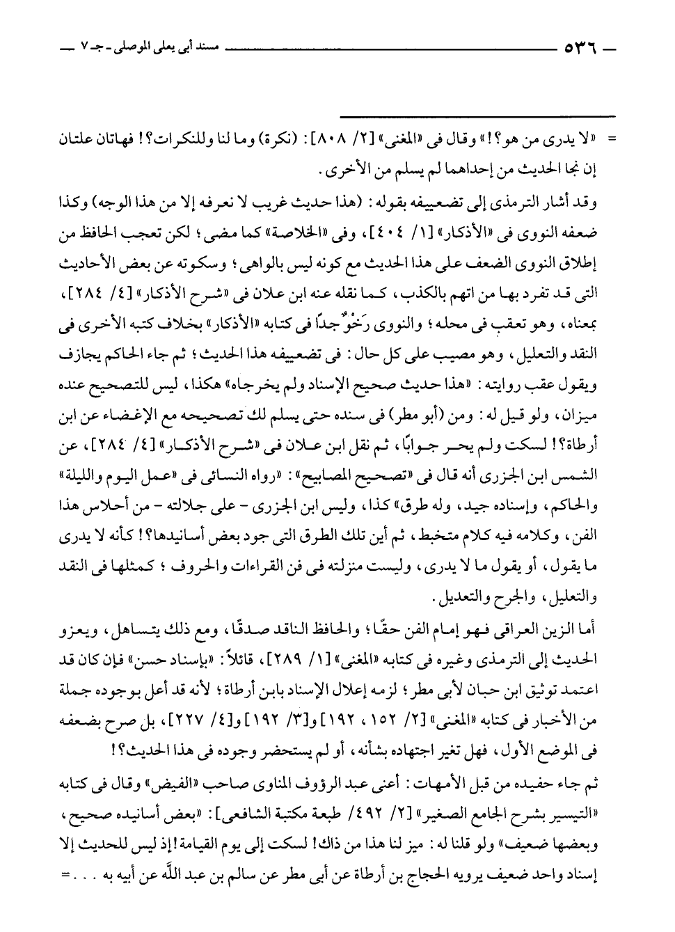 أما الزين العراقى فهو إمام الفن حقًا؛ والحافظ الناقد صدقًا، ومع ذلك يتساهل، ويعزو الحديث إلى الترمذى وغيره في كتابه "المغنى" [١/ ٢٨٩]، قائلًا: "بإسناد حسن" فإن كان قد اعتمد توثيق ابن حبان لأبى مطر؛ لزمه إعلال الإسناد بابن أرطاة؛ لأنه قد أعل بوجوده جملة من الأخبار في كتابه "المغنى" [٢/ ١٥٢، ١٩٢] و [٣/ ١٩٢] و [٤/ ٢٢٧]، بل صرح بضعفه في الموضع الأول، فهل تغير اجتهاده بشأنه، أو لم يستحضر وجوده في هذا الحديث؟!
