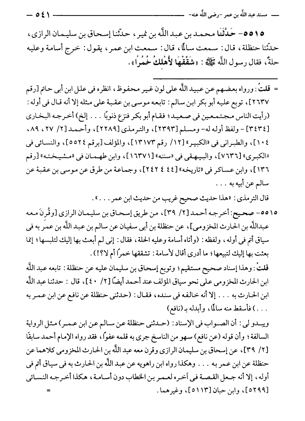 ٥٥١٥ - حَدَّثَنَا محمد بن عبد الله بن نمير، حدّثنا إسحاق بن سليمان الرازى، حدّثنا حنظلة، قال: سمعت سالمًا، قال: سمعت ابن عمر، يقول: خرج أسامة وعليه حلةٌ، فقال رسول الله - صلى الله عليه وسلم -: "شَقِّقْهَا لأُهْلِك خُمُرًا".