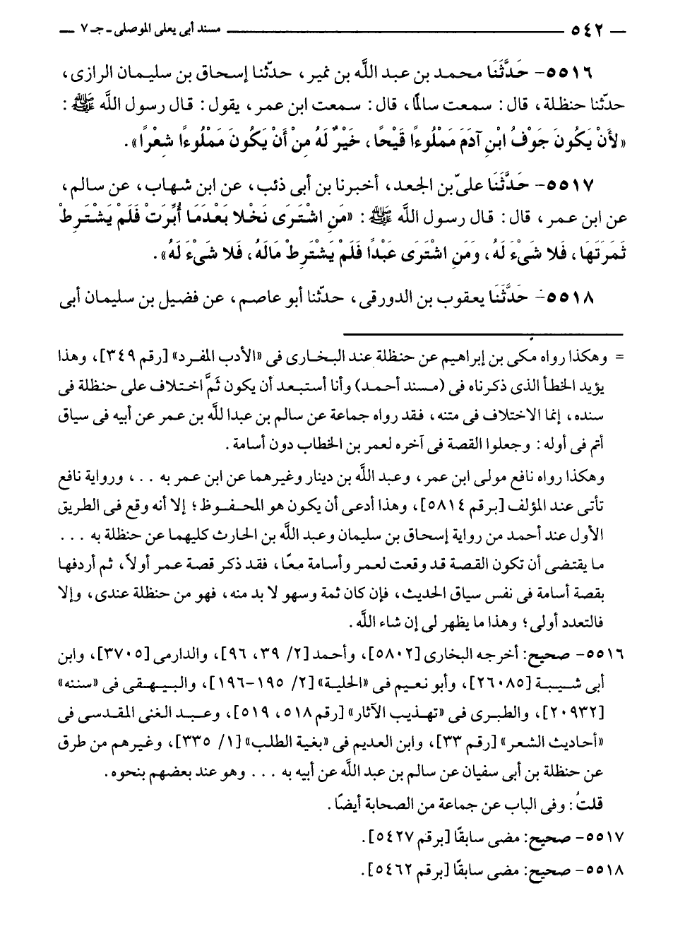٥٥١٦ - حَدَّثَنَا محمد بن عبد الله بن نمير، حدّثنا إسحاق بن سليمان الرازى، حدّثنا حنظلة، قال: سمعت سالمًا، قال: سمعت ابن عمر، يقول: قال رسول الله - صلى الله عليه وسلم -: "لأَنْ يَكُونَ جَوْفُ ابْنِ آدَمَ مَمْلُوءًا قَيْحًا، خَيْرٌ لَهُ مِنْ أَنْ يَكُونَ مَمْلُوءًا شِعْرًا".