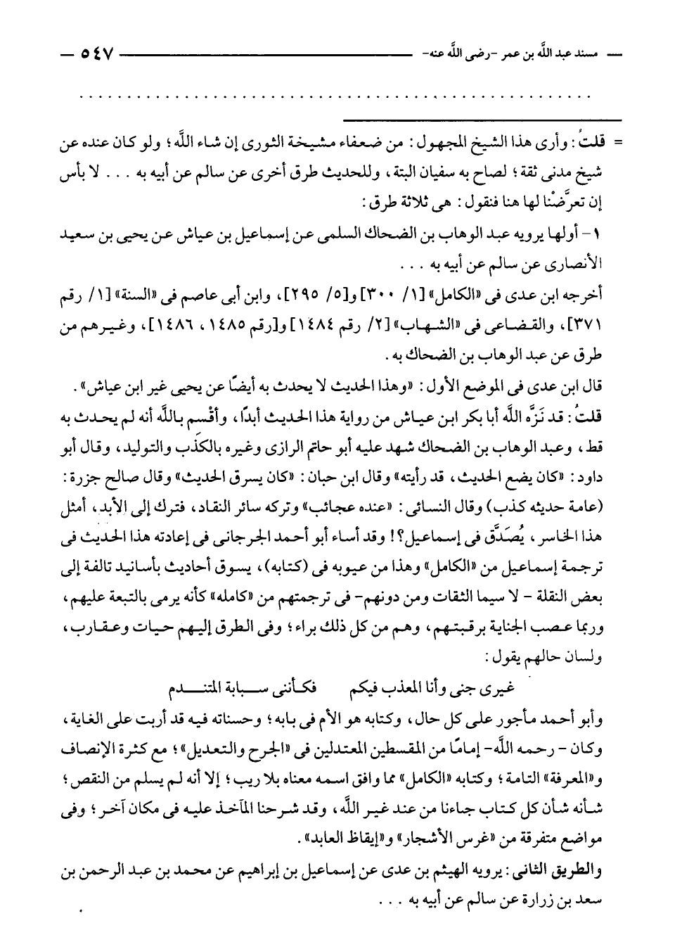 وأبو أحمد مأجور على كل حال، وكتابه هو الأم في بابه؛ وحسناته فيه قد أربت على الغاية، وكان - رحمه الله - إمامًا من المقسطين المعتدلين في "الجرح والتعديل"؛ مع كثرة الإنصاف و"المعرفة" التامة؛ وكتابه "الكامل" مما وافق اسمه معناه بلا ريب؛ إلا أنه لم يسلم من النقص؛ شأنه شأن كل كتاب جاءنا من عند غير الله، وقد شرحنا المآخذ عليه في مكان آخر؛ وفى مواضع متفرقة من "غرس الأشجار" و"إيقاظ العابد".