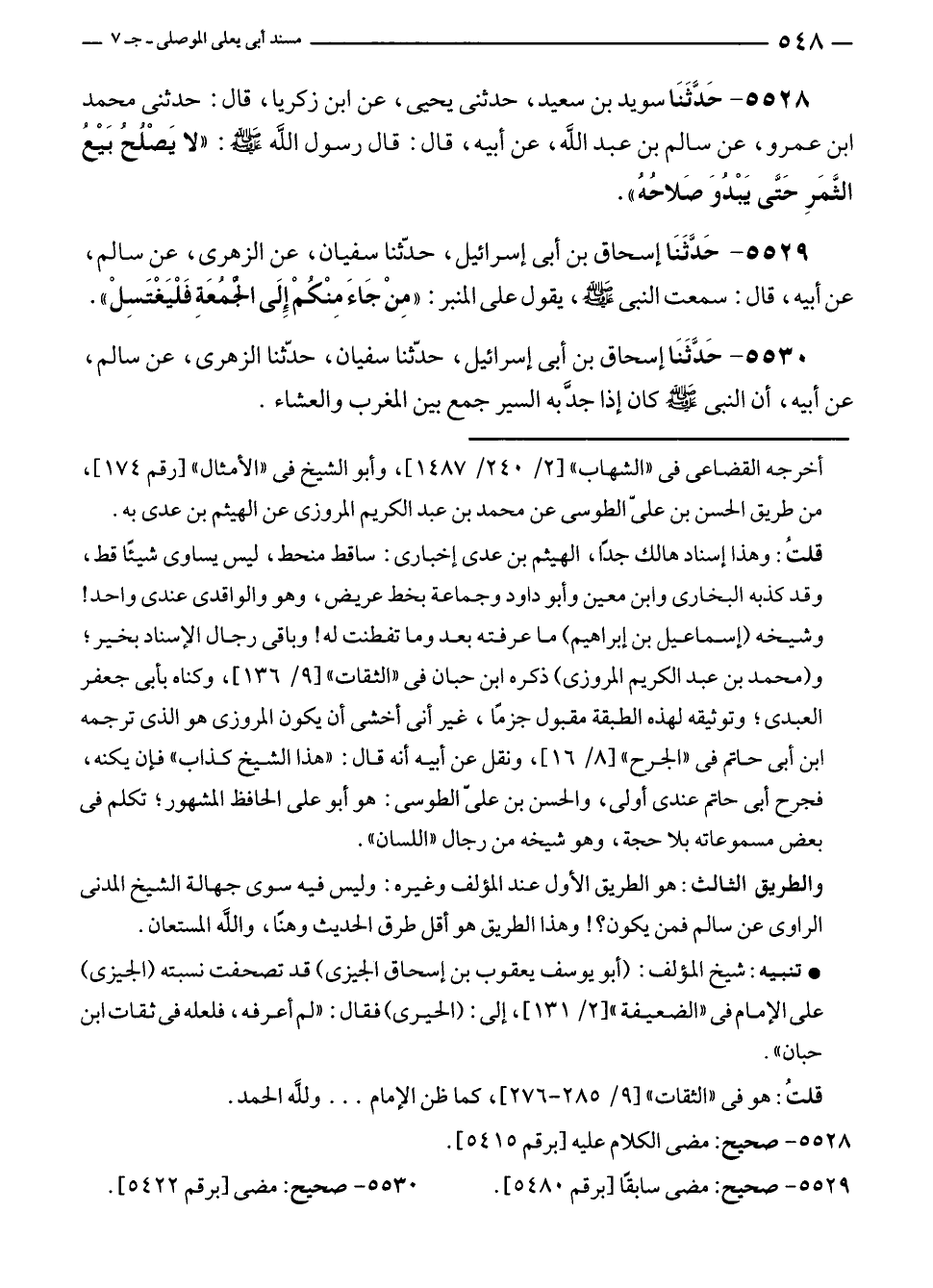٥٥٢٨ - حَدَّثَنَا سويد بن سعيد، حدثنى يحيى، عن ابن زكريا، قال: حدثنى محمد بن عمرو، عن سالم بن عبد الله، عن أبيه، قال: قال رسول الله - صلى الله عليه وسلم -: "لا يَصْلُحُ بَيْعُ الثَّمَرِ حَتَّى يَبْدُوَ صَلاحُهُ".