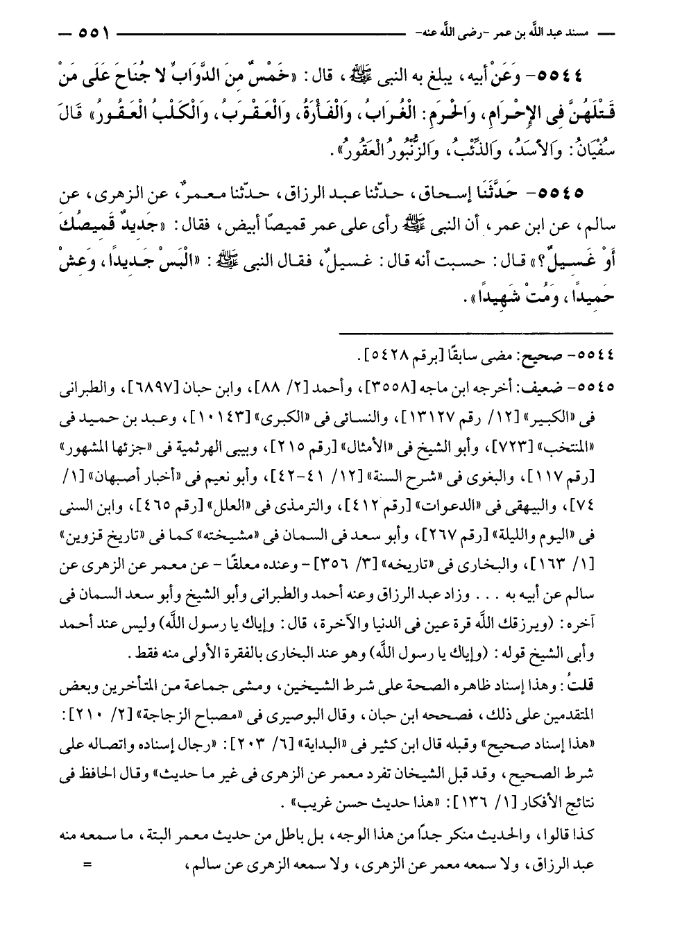 ٥٥٤٥ - حَدَّثَنَا إسحاق، حدّثنا عبد الرزاق، حدّثنا معمرٌ، عن الزهرى، عن سالم، عن ابن عمر، أن النبي - صلى الله عليه وسلم - رأى على عمر قميصًا أبيض، فقال: "جَدِيدٌ قَمِيصُكَ أَوْ غَسِيلٌ؟ " قال: حسبت أنه قال: غسيلٌ، فقال النبي - صلى الله عليه وسلم -: "الْبَسْ جَدِيدًا، وَعِشْ حَمِيدًا، وَمُتْ شَهِيدًا".