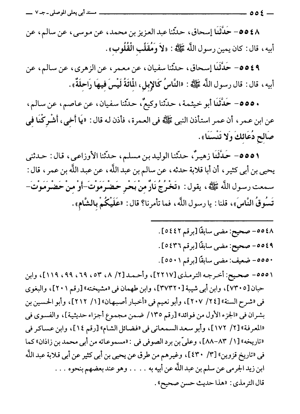 ٥٥٥١ - صحيح: أخرجه الترمذى [٢٢١٧]، وأحمد [٢/ ٨، ٥٣، ٦٩، ٩٩، ١١٩]، وابن حبان [٧٣٠٥]، وابن أبى شيبة [٣٧٣٢٠]، وابن طهمان في "مشيخته" [رقم ٢٠١]، والبغوى في "شرح السنة" [٢٤/ ٢٠٧]، وأبو نعيم في "أخبار أصبهان" [١/ ٢١٢]، وأبو الحسين بن بشران في "الجزء الأول من فوائد" [رقم ١٣٥/ ضمن مجموع أجزاء حديثية]، والفسوى في "المعرفة" [٢/ ١٧٢]، وأبو سعد السمعانى في "فضائل الشام" [رقم ١٤]، وابن عساكر في "تاريخه" [١/ ٨٣ - ٨٨]، وعليّ بن برد الصوفى في: "مسموعاته من أبى محمد بن زاذان" كما في "تاريخ قزوين" [٣/ ٤٣٠]، وغيرهم من طرق عن يحيى بن أبى كثير عن أبى قلابة عبد الله بن زيد الجرمى عن سلم بن عبد الله عن أبيه به .... وهو عند بعضهم بنحوه ...
