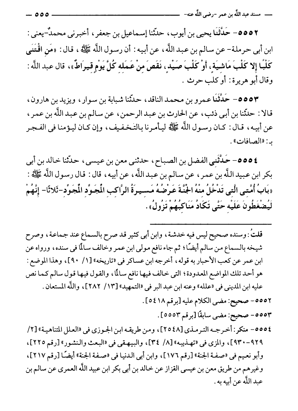 ٥٥٥٢ - حَدَّثَنَا يحيى بن أيوب، حدّثنا إسماعيل بن جعفر، أخبرنى محمدٌ - يعنى: ابن أبى حرملة - عن سالم بن عبد الله، عن أبيه: أن رسول الله - صلى الله عليه وسلم -، قال: "مَنِ اقْتَنَى كَلْبًا إلا كَلْبَ مَاشِيَةِ، أَوْ كَلْبَ صَيْدٍ، نَقَصَ مِنْ عَمَلِهِ كُلَّ يَوْمٍ قِيرَاطٌ"، قال عبد الله: وقال أبو هريرة: أو كلب حرث.