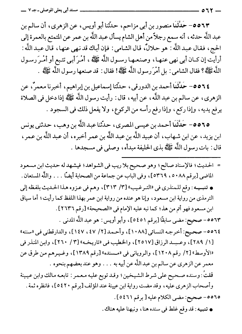 ٥٥٦٤ - حَدَّثَنَا أحمد بن الدورقى، حدّثنا إسماعيل بن إبراهيم، أخبرنا معمرٌ، عن الزهرى، عن سالم بن عبد الله، عن أبيه، قال: رأيت رسول الله - صلى الله عليه وسلم - إذا دخل في الصلاة يرفع يديه، وإذا ركع، وإذا رفع رأسه من الركوع، ولا يفعل ذلك في السجود.