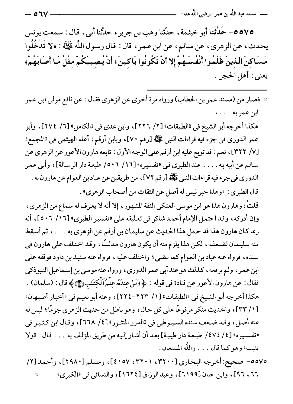 = فصار من (مسند عمر بن الخطاب) ورواه مرة أخرى عن الزهرى فقال: عن نافع مولى ابن عمر بن عمر به ... ، هكذا أخرجه أبو الشيخ في "الطبقات" [٢/ ٢٢٦]، وابن عدى في "الكامل" [٦/ ٢٧٤]، وأبو عمر الدورى في جزء فيه قراءات النبي - صلى الله عليه وسلم -[رقم ٧٠]، وبابن أرقم: أعله الهيثمى في "المجمع" [٧/ ٣٢٢]، نعم: قد توبع عليه ابن أرقم على الوجه الأول: تابعه هارون الأعور عن الزهرى عن سالم عن أبيه به .... عند الطبرى في "تفسيره" [١٦/ ٥٠٦/ طبعة دار الرسالة]، وأبى عمر الدورى في جزء فيه قراءات النبي - صلى الله عليه وسلم -[رقم ٧٢]، من طريقين عن عباد بن العوام عن هارون به.