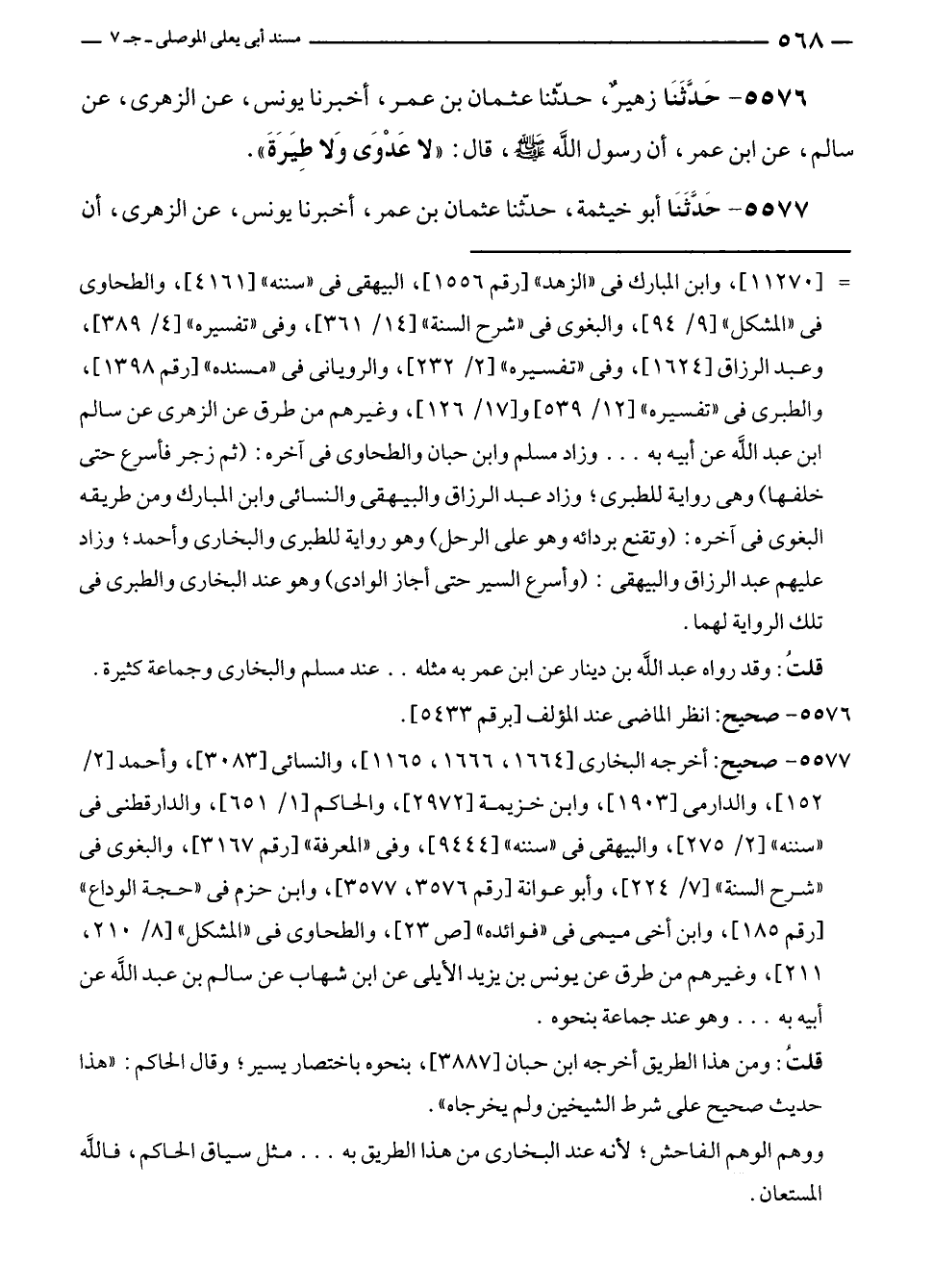 ٥٥٧٦ - حَدَّثَنَا زهيرٌ، حدّثنا عثمان بن عمر، أخبرنا يونس، عن الزهرى، عن سالم، عن ابن عمر، أن رسول الله - صلى الله عليه وسلم -، قال: "لا عَدْوَى وَلا طِيَرَةَ".